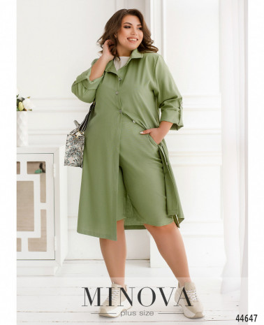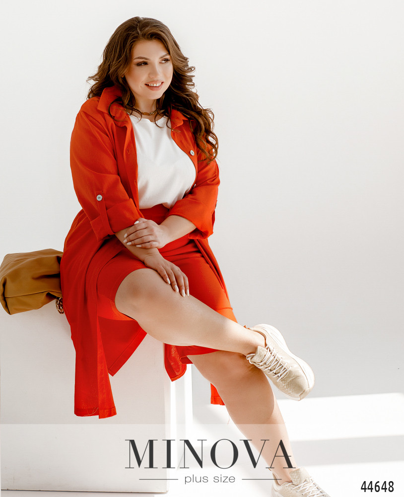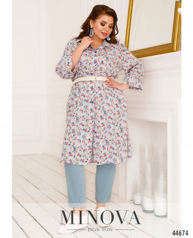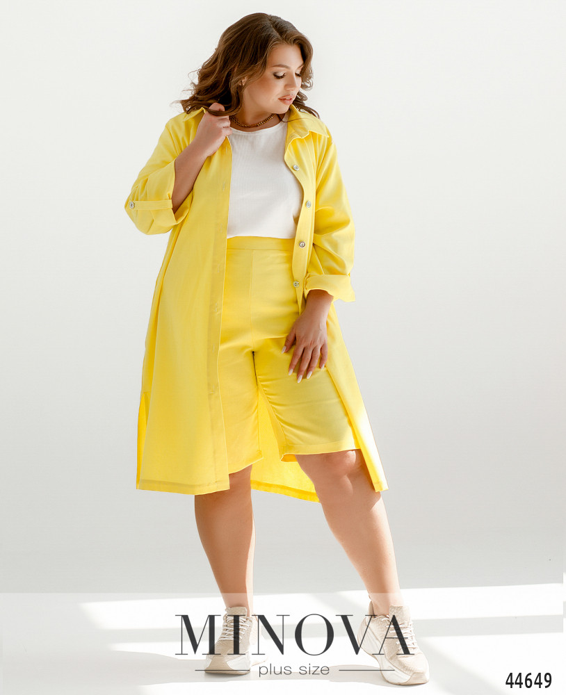 Елегантний та стильний костюм трійка великого розміру. Верхня сорочка подовжена, з відкладним комірцем, на грудях накладна кишеня, з боків - довгі розрізи. На рукавах манжети, на манжетах по одному гудзику. Брюки з високою талією, з боків - кишені в шві, до поясу вшито резинку. Майка з півкруглим вирізом горловини, на грудях виточки, з боків подолу - розрізи. Без кишень і застібок.