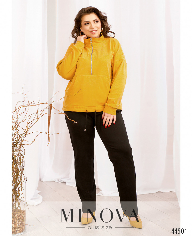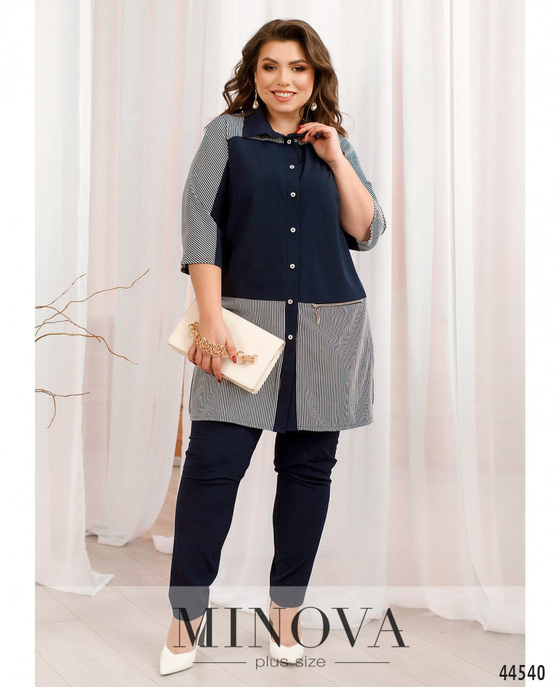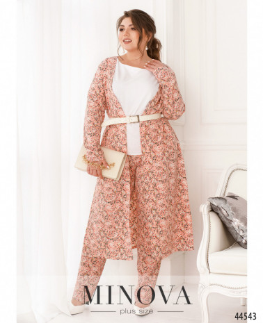 Яркий и оригинальный костюм-тройка батал. Кардиган без застёжек и карманов, рукава без манжет, на подоле по бокам очень длинные разрезы. Футболка с коротким рукавом, вырезом горловины "лодочка", без застёжек и карманов. Брюки с высокой посадкой, в пояс вшита резинка, по бокам - карманы в шве, застёжек нет.