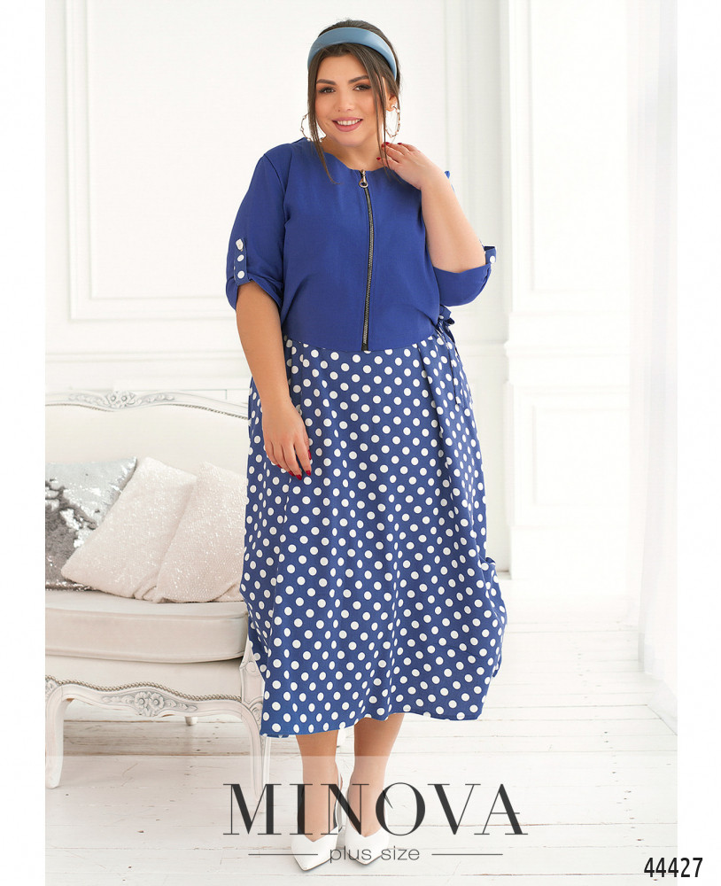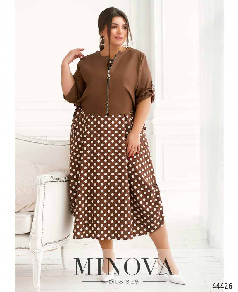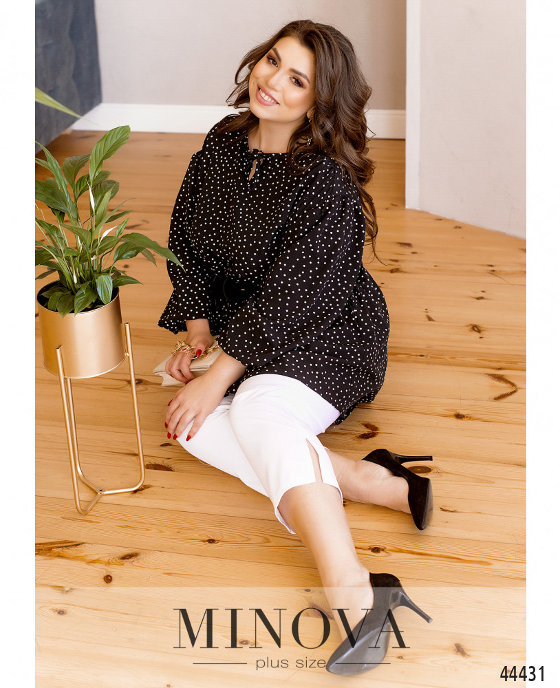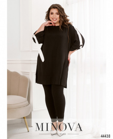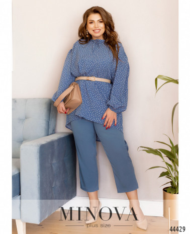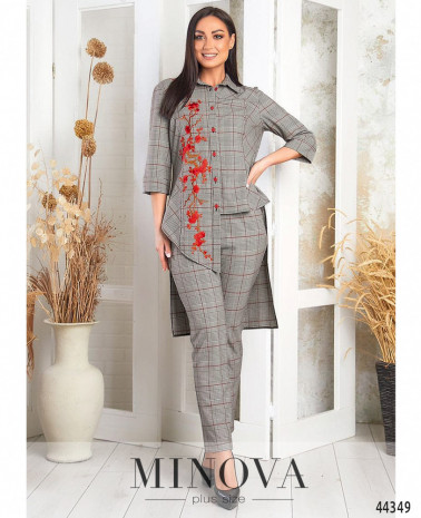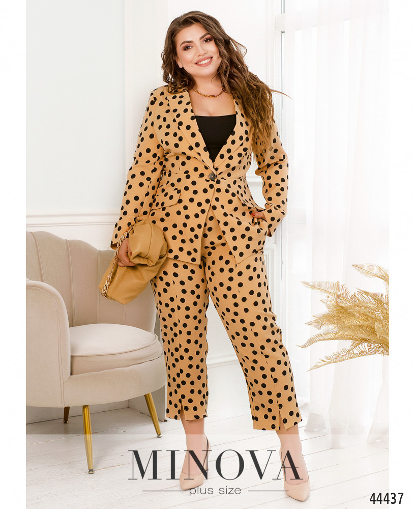 Яскравий та оригінальний костюм-двійка батал. Піджак з різьбленими лацканами, без підкладки, рукава без гудзиків. Спереду - декоративні клапани, кишень немає. Однобортний, застібається на один гудзик. Поділ відрізний, на талії спереду повздовжні виточки вгору, до грудей. Є підплечники. Брюки зі вшитою ззаду резинкою, посадка висока, з боків - кишені в шві, на стегнах ззаду декоративні клапани.