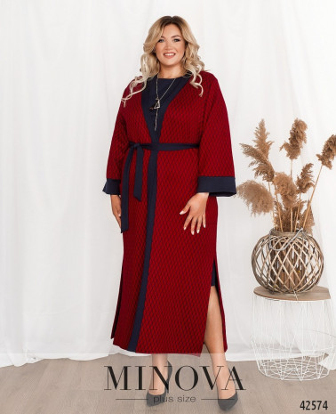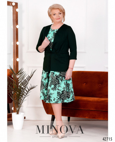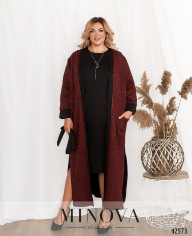 Мягкий и очень комфортный костюм батал. Платье застегивается на потайную змейку по спинке, на груди и на спине вытачки, вырез горловины полукруглый, в комплекте пояс в тон. Кардиган с накладными карманами, по бокам подола - длинные разрезы. Подкладки и застёжек нет. Пояс/аксессуар входит в комплект.
