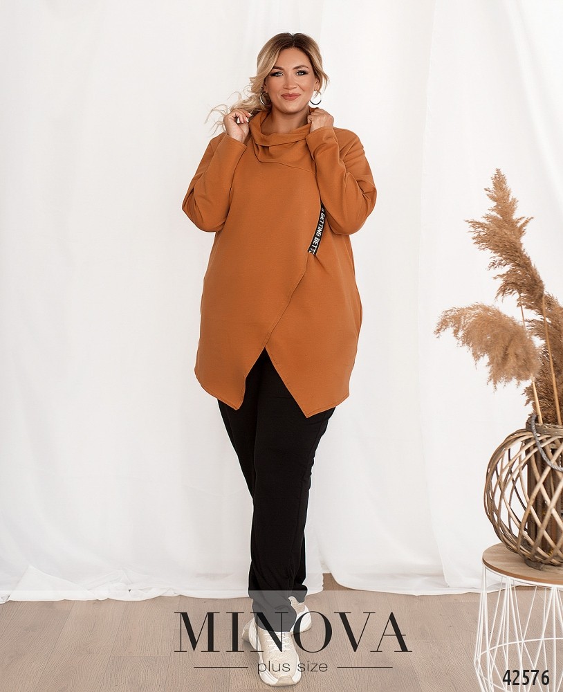 Яркий и удобный костюм-двойка батал. В комплекте - пончо с декоративной змейкой под лентой, и с рукавами. Рукава без манжет. Воротник-хомут. Застёжек нет, по бокам врезные карманы. Брюки с высокой талией и карманами по бокам, в пояс вшита резинка.