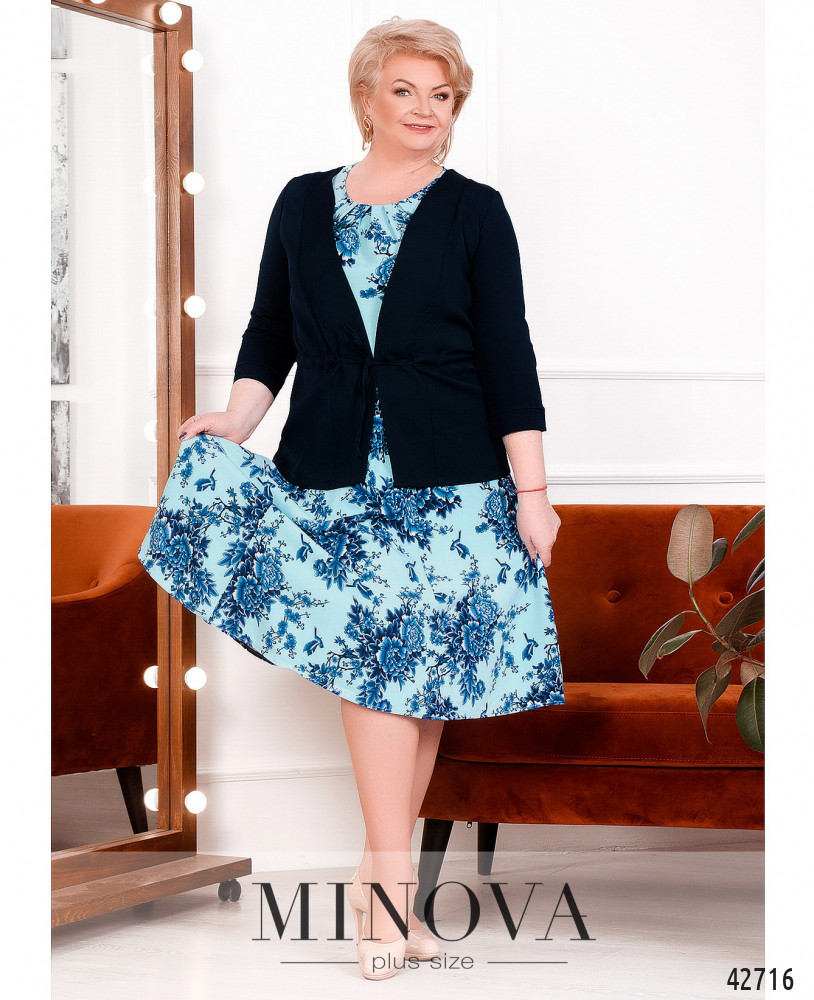 Нарядный костюм батал с платьем и жакетом. Жакет без застёжек и карманов, рукава с небольшими манжетами. На талии пропущен шнурок. Без подкладки. Платье с резинкой, вшитой в талию. Застёжек и карманов нет. Ткань от выреза горловины присобрана и расходится оборками на груди. Рукава без манжет.