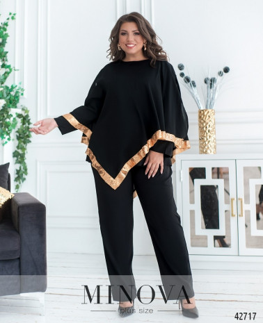 Стильный костюм-тройка батал с накидкой. Накидка полупрозрачная, от плеча - длинные разрезы, без рукавов. Декорирована манжетом с пайетками с обеих сторон. Вырез горловины полукруглый, застёжек и карманов нет. Блуза без застёжек и карманов, рукава без манжет, по бокам подола - небольшие разрезы, на груди вытачки. Брюки с высокой талией, в пояс сзади вшита резинка, по бокам врезные карманы, без застёжек.