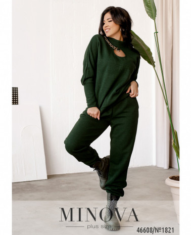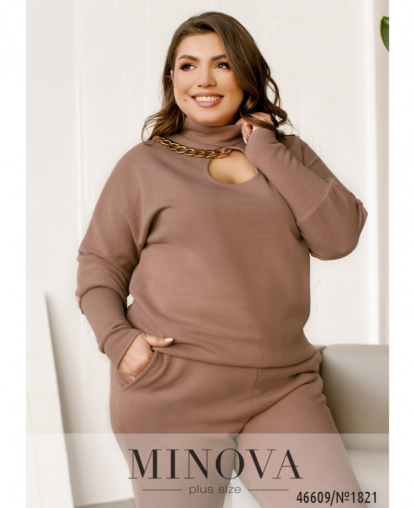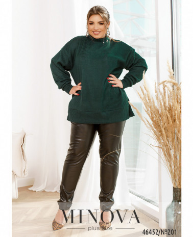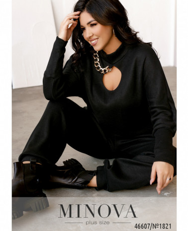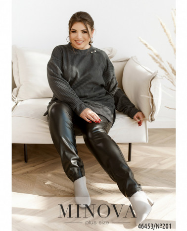 Жіночний костюм, що складається з штанів і туніки, можна носити разом або розділити, створюючи різні образи з іншими речами. Мінімалістичні чорні штани на резинці з кишенями, виконані з еко шкіри, ідеально доповнені м'якою однотонною тунікою з приспущеною лінією плечей і невеликими розрізами з боків.
