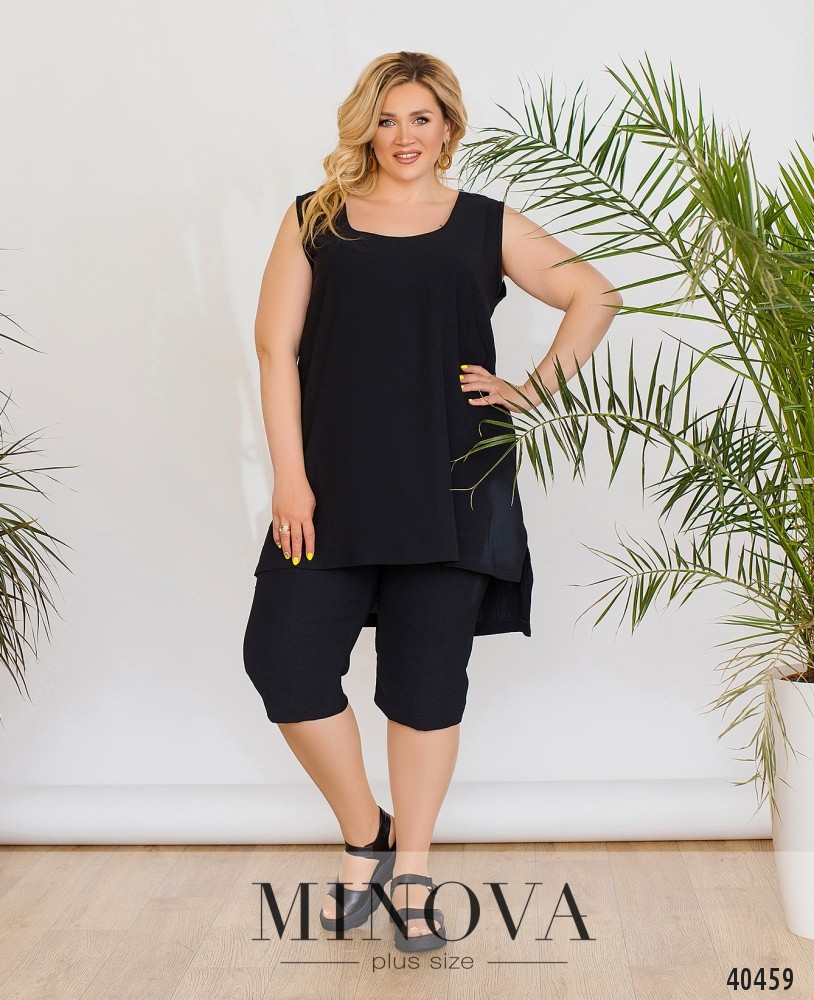 Яркий и оригинальный костюм-двойка батал с брюками и туникой. Туника с разрезами по бокам подола, без застёжек и карманов, рукава без манжет, вырез горловины полукруглый, на груди вытачки. Брюки со вшитой в пояс резинкой, без карманов, с лампасами.