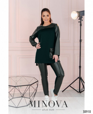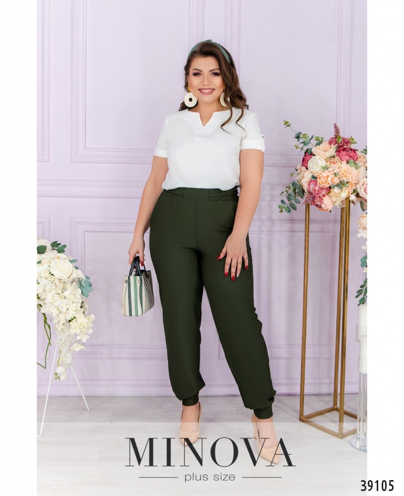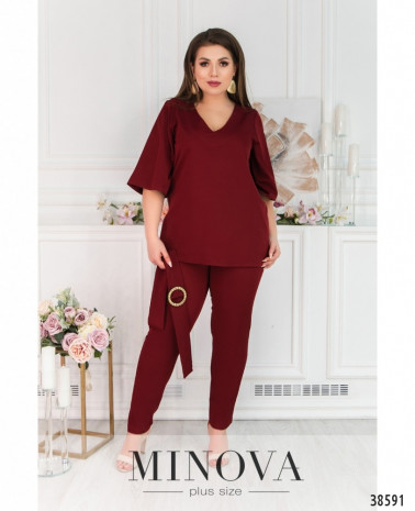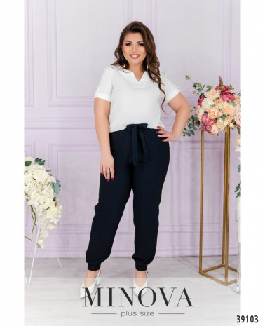 Ніжний костюм-двійка плюс сайз з блузою та брюками. Брюки високої посадки, до поясу ззаду вшито резинку, з боків – кишені в швах, по центру напрасовані «стрілки». Блуза з розкльошеними рукавами без манжетів, виріз горловини V-форми, застібок та кишень немає. В комплекті пояс з круглою пряжкою.