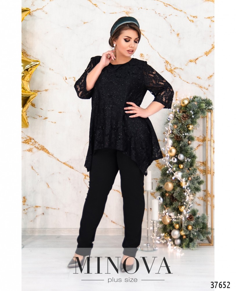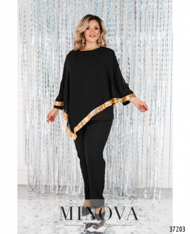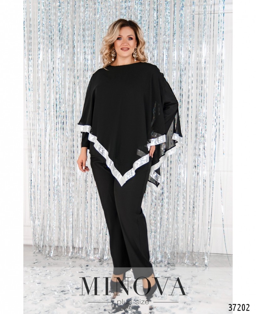 Очень нарядный, оригинальный и праздничный костюм-тройка из свежей коллекции женской одежды от Minova идеально подходит для девушек с «грушевой» фигурой или мелкими несовершенствами. Всё благодаря накидке-пончо из очень лёгкой ткани, накидка с широким полукруглым вырезом горловины, по подолу оторочена рядом блестящих пайеток, карманов и застёжек нет, по бокам – небольшие разрезы. Топ без застёжек и карманов, с вытачками на груди, рукавами длиной ¾, из мягкой лёгкой ткани. Брюки со вшитой в пояс резинкой и врезными карманами по бокам, посадка высокая, крой прямой. Сделайте свой образ по-настоящему незабываемым, дополнив его подходящими украшениями и обувью!