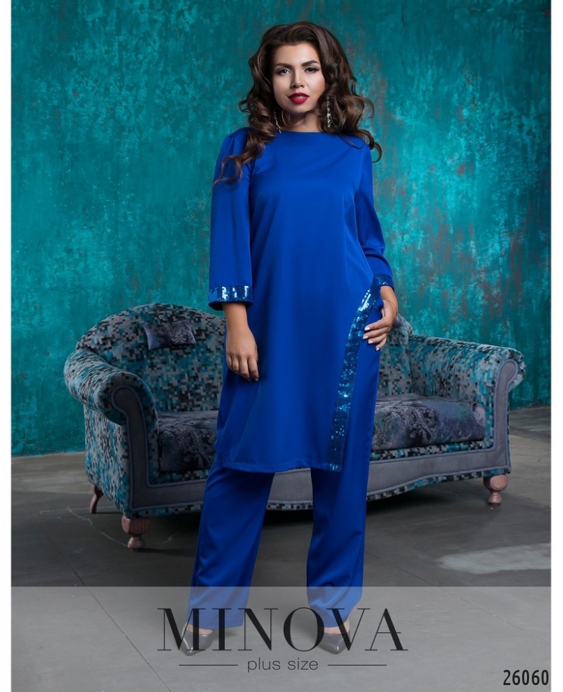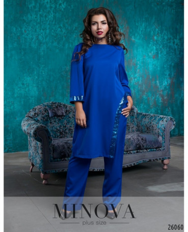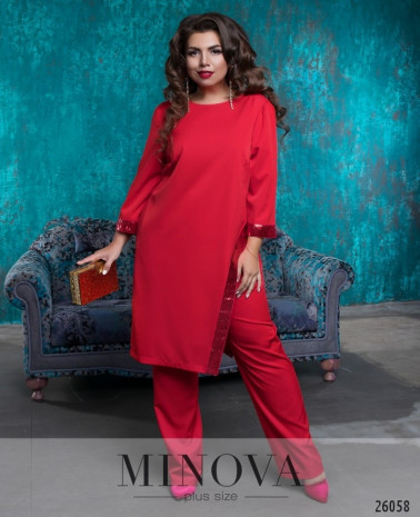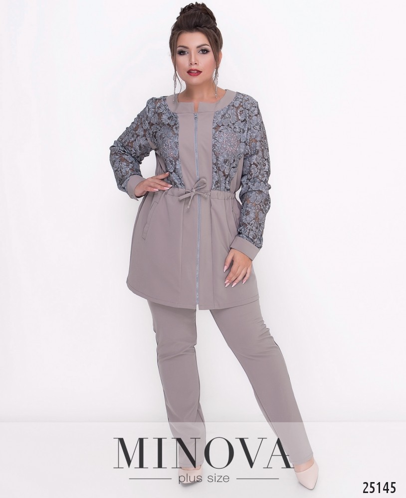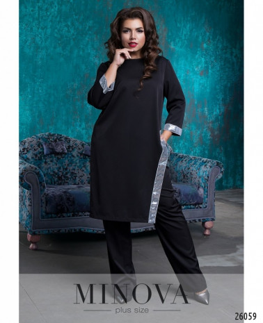 Костюм-двійка зі вставками з еко шкіри. Костюм представлений вільною кофтою з короткими рукавами та прямими брюками з лампасами. Розкльошена туніка з розрізами з боків. Рукава та декоративна планка виготовлені з еко шкіри. Планка прикрашена люверсами. Брюки з кишенями прикрашені лампасами з еко шкіри. Пояс представлений резинкою.