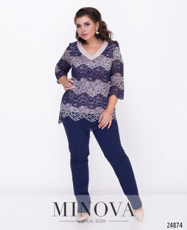 Элегантный костюм-двойка: Брюки прямого кроя на молнии. По бокам небольшие вставки из резинки Блуза немного удлинена, рукав ¾ и V-образным вырезом. Изделие состоит из однотонной подкладки и верхнего слоя из сетки с набивным кружевным рисунком. По спинке скрытая молния под кружевной сеткой.