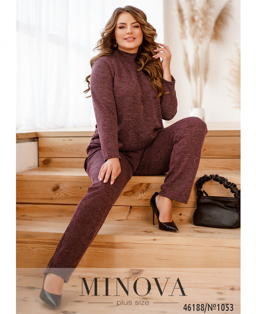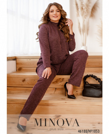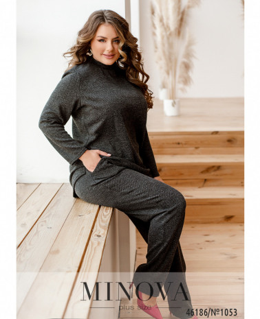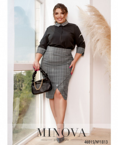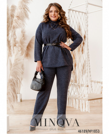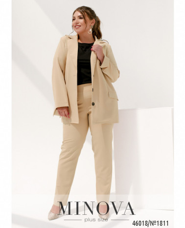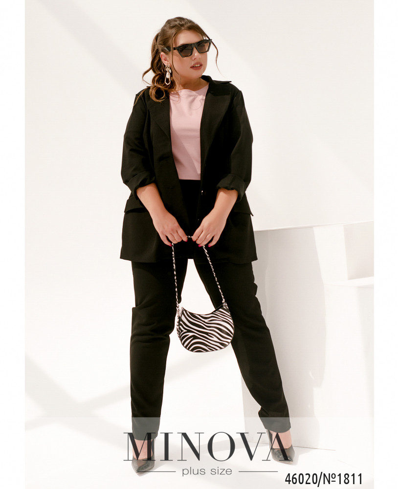 Элегантный и стильный костюм тройка большого размера. Верхняя рубашка удлинённая, с отложным воротничком, на груди накладной карман, по бокам - длинные разрезы. На рукавах манжеты, на манжетах по одной пуговке. Брюки с высокой талией, по бокам - карманы в шве, в пояс вшита резинка. Майка с полукруглым вырезом горловины, на груди вытачки, по бокам подола - разрезы. Без карманов и застежек.