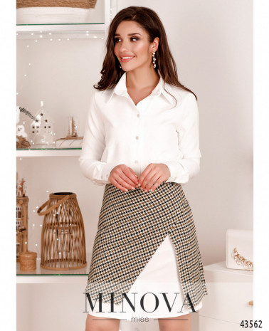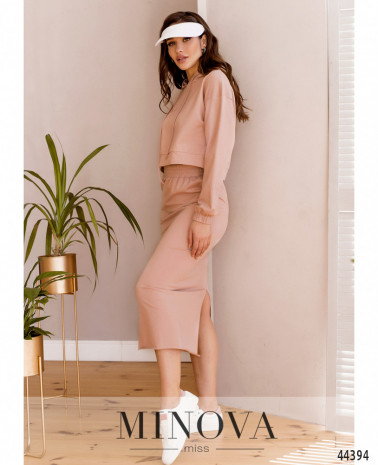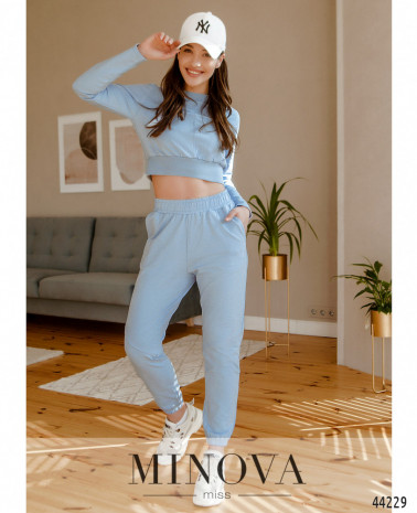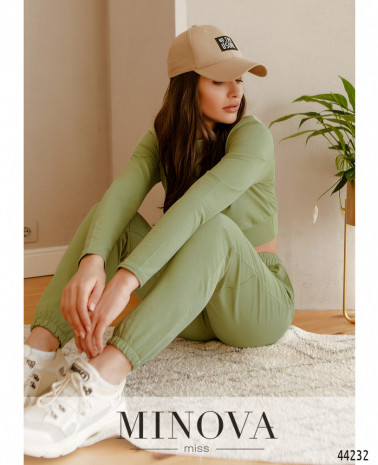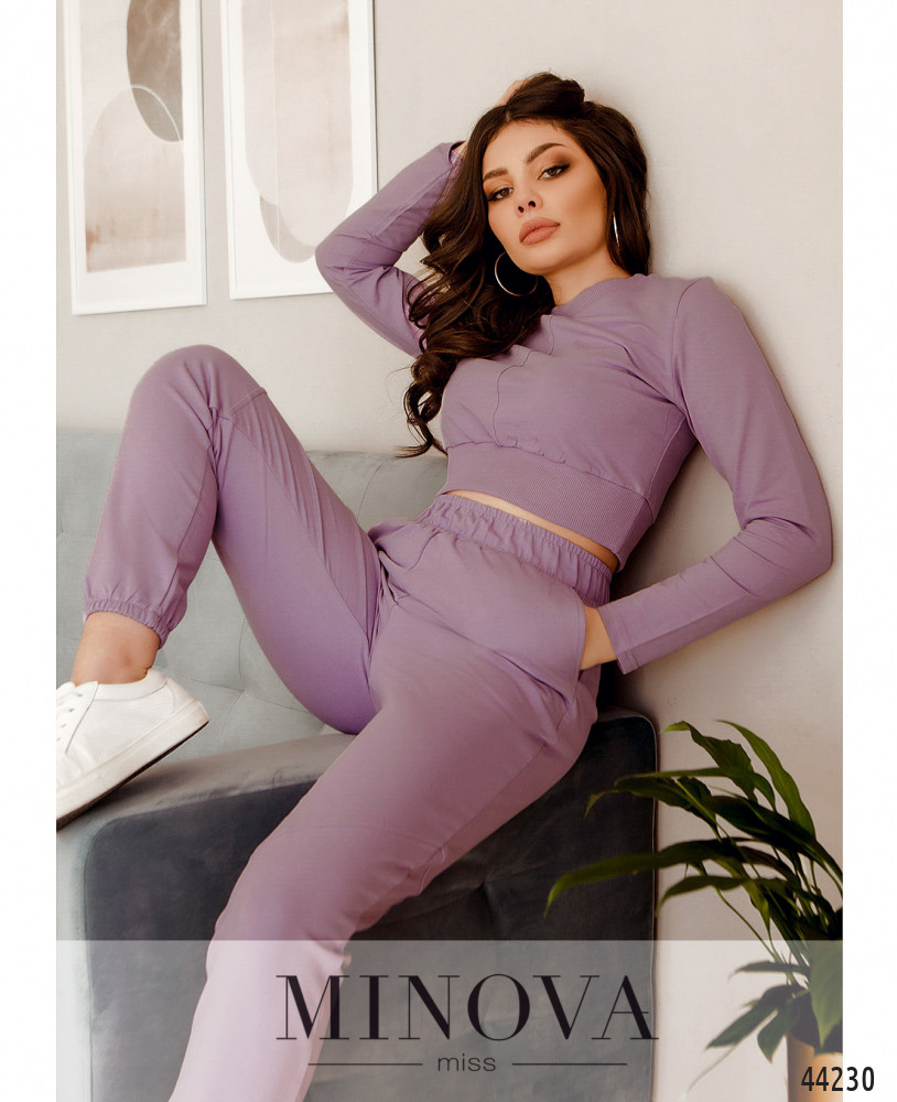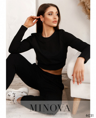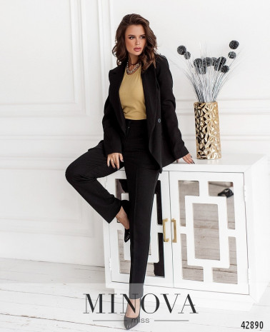 Элегантный костюм-двойка, пиджак двубортный, застёгивается на левую пуговицу. В наличии врезные карманы. Правая полочка с фигурным краем. Лацканы резные. Пиджак с подкладкой. На полочках длинный продольный шов. Брюки с высокой посадкой, застёгиваются на молнию под ширинкой и пуговицу, по бокам - врезные карманы, снизу небольшие разрезы по бокам.