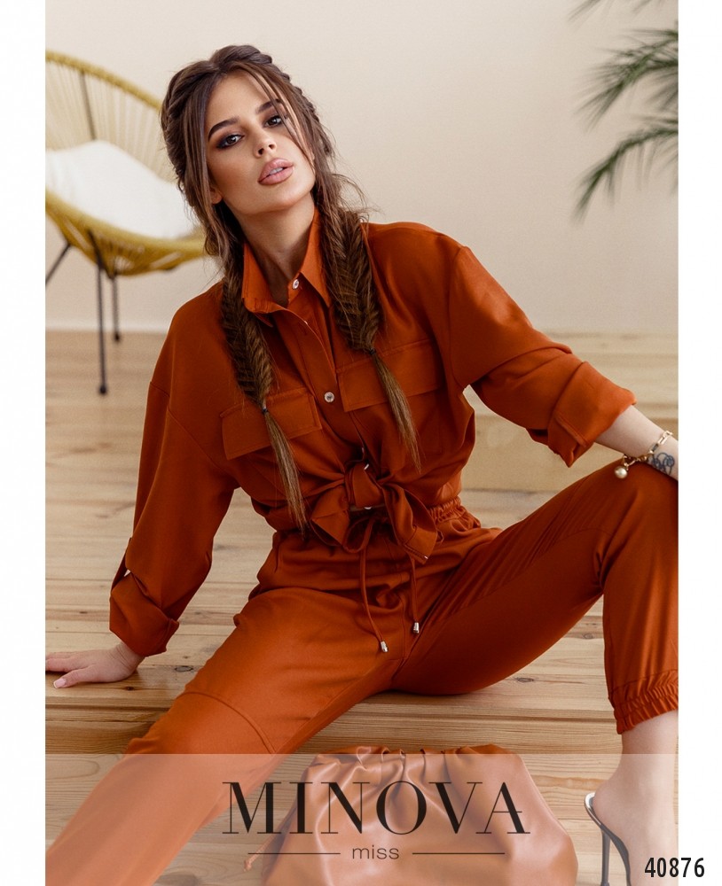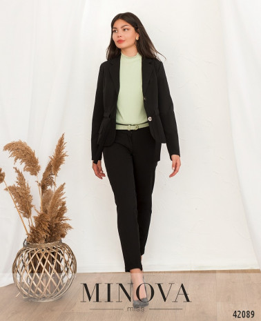 Оригінальний костюм-двійка з піджаком та брюками. Піджак з підплічниками та підкладкою, двобортний, застібається на лівий ряд гудзиків. Верхняя частина лацканів з тієї ж тканини, з якої виготовлені брюки. Тканина перфорована. З боків - кишені в швах. Брюки з високою талією, зсередини тканина м\'яка, застібаються на гудзик та блискавку під ширинкою. З боків - кишені в швах, є шлейки для ременя. Пояс є, з ненаскрізною декоративною перфорацією.