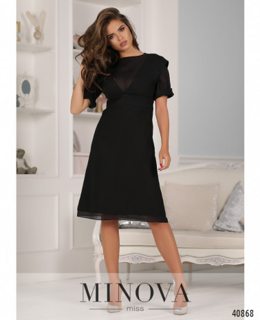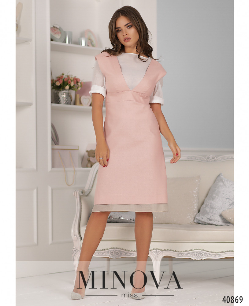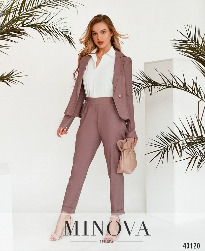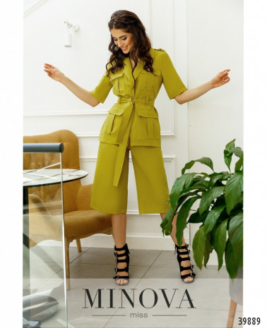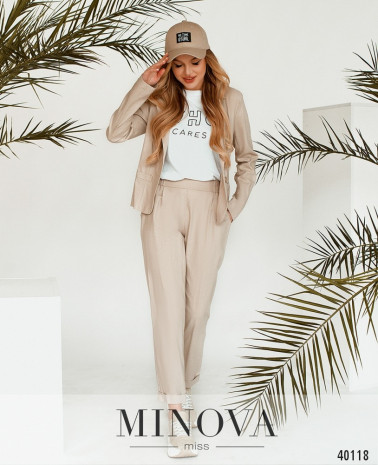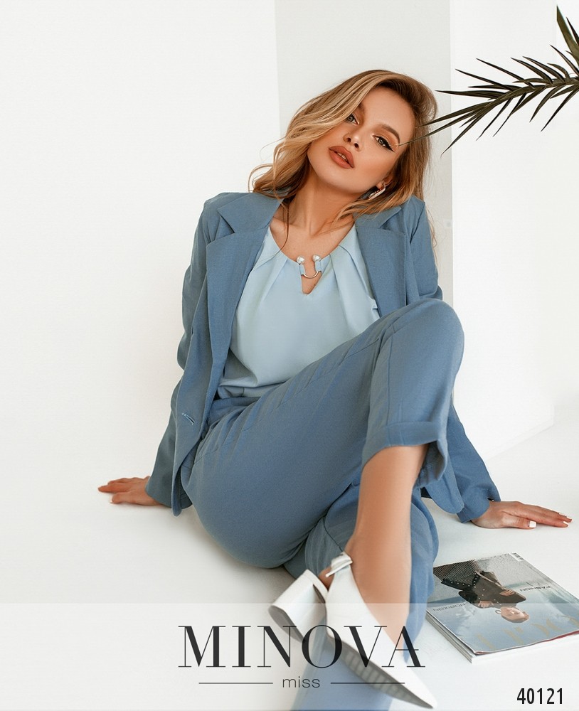 Оригінальний костюм із сарафаном та легкою кофточкою. Сарафан без кишень, застібається на блискавку, вшиту по спинці. Внизу на подолі підшита легка тканина, як на блузі. Виріз прикрашений спереду та по спинці декоративним швом. Блуза без застібок та кишень, з невеликими відворотами на рукавах, виріз горловини \"човник\".