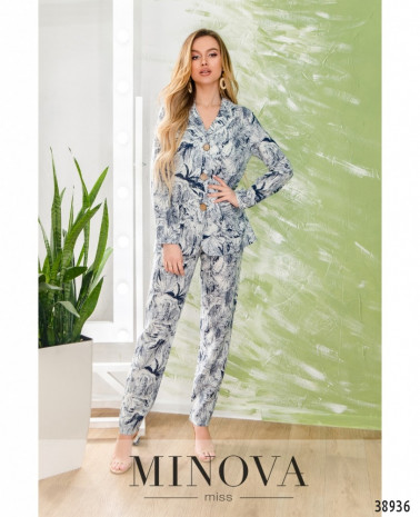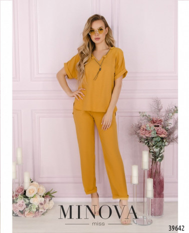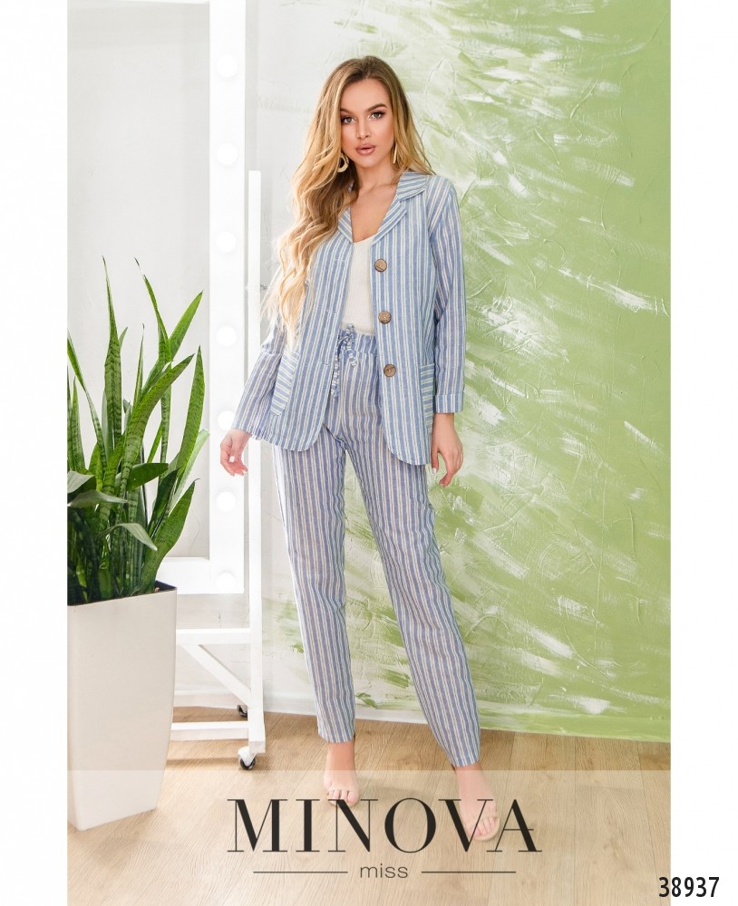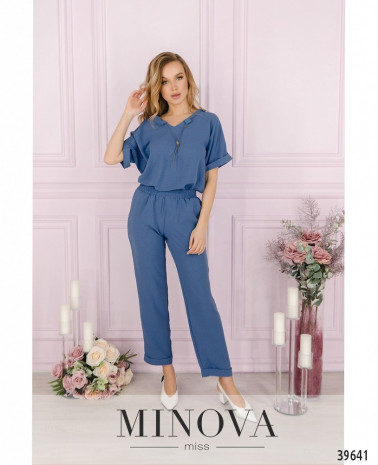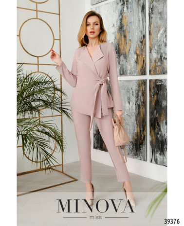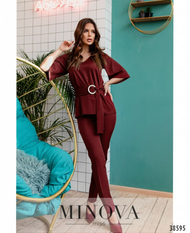 Строгий легкий костюм з брюками та блузою. Блуза з вирізом горловини V-форми, рукава дещо розкльошені, без манжетів, застібок та кишень немає. Брюки з високою талією, з напрасованими «стрілками», застібаються на гудзик та блискавку під ширинкою, до поясу ззаду вшито резинку, з боків - кишені. В комплекті – пояс у колір з круглою пряжкою.