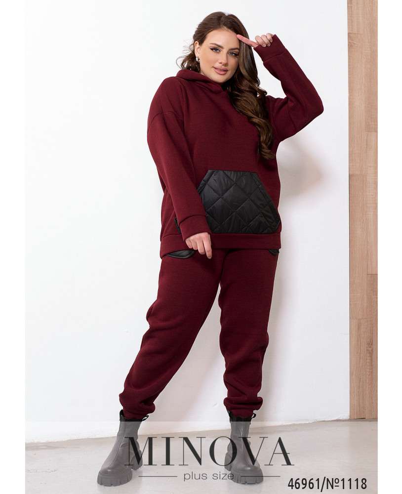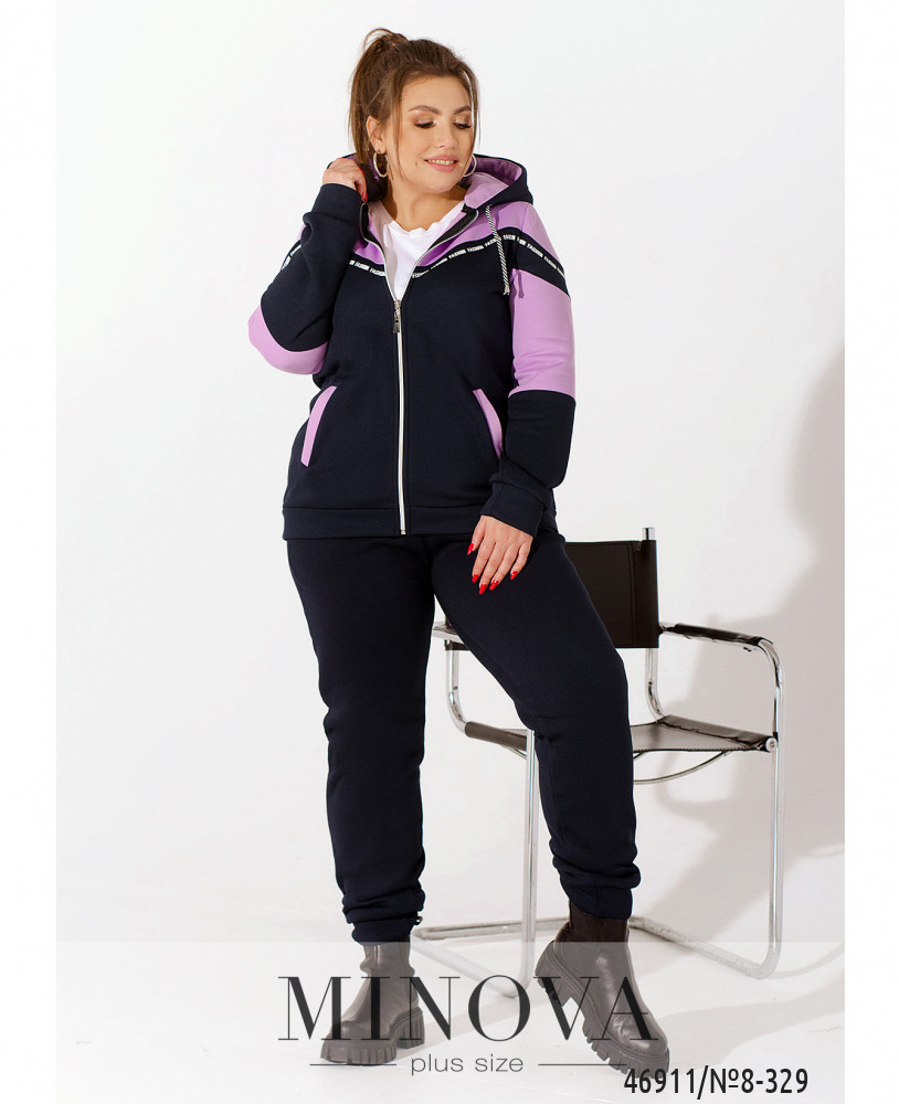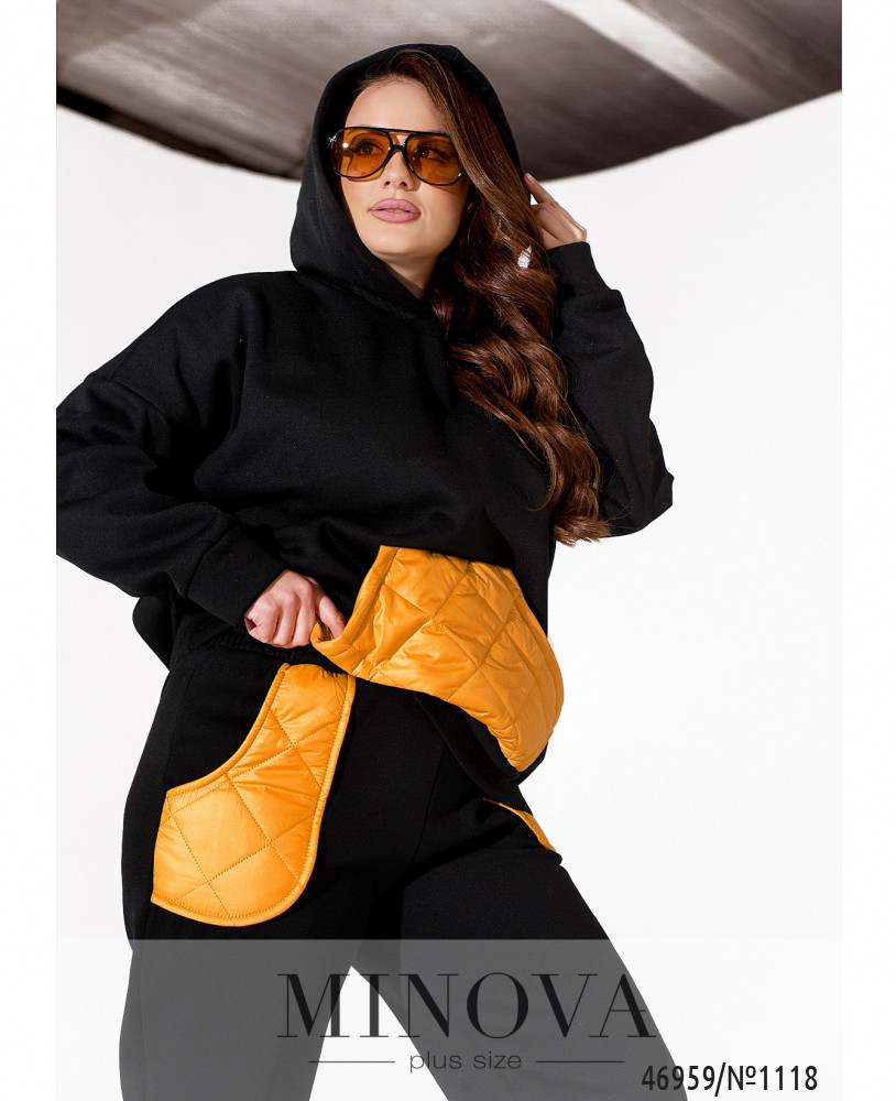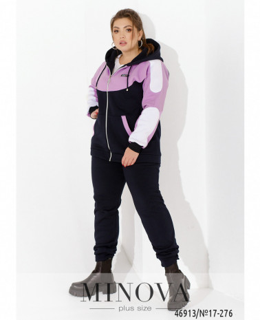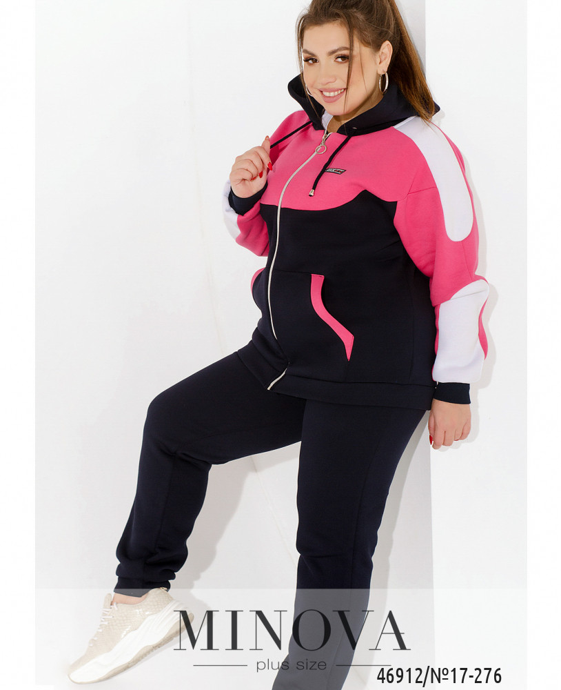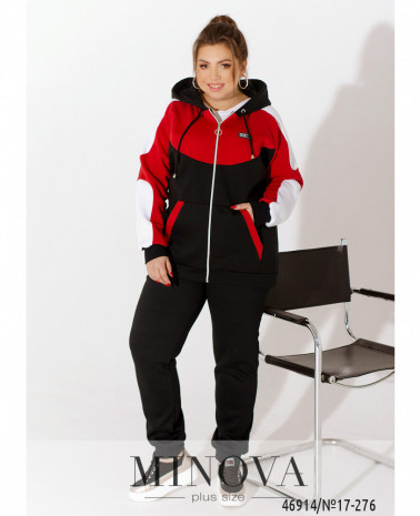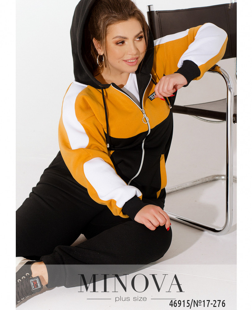 Яскравий спортивний костюм, виконаний з м'якої тканини, дозволить створювати стильні і різноманітні образи у вуличному стилі. У комплект входять лаконічні однотонні штани на резинці з кишенями в бічних швах і манжетами, а також виразна кофта, з яскравими вставками, доповнена капюшоном, кишенями з боків і змійкою по центру.