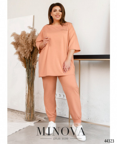 Стильний костюм-двійка великого розміру, футболка з рукавами без манжетів, виріз горловини півкруглий, без застібок і кишень. Брюки зі вшитою до манжетів і до поясу резинкою, з боків - кишені в шві, талія висока.