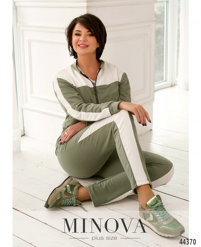Елегантний спортивний костюм батал. Толстовка зі сквозною блискавкою, рукава та поділ з м'яким манжетом, на рукавах лампаси. Комірець з м'яким манжетом. Кишень немає. Брюки з високою талією, з боків - кишені в шві і лампаси, до поясу вшито резинку.