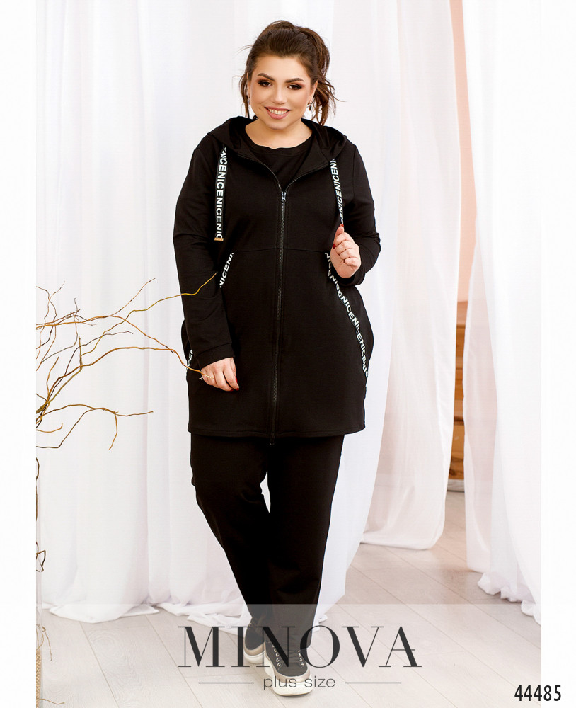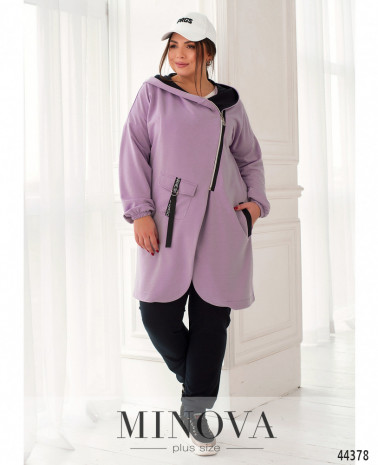 Елегантний та стильний спортивний костюм великого розміру. Туніка довга, зі змійкою, розташованою зліва. Змійка не в повну довжину, під нею - ще відріз тканини. Справа на стегні накладна кишеня з клапаном, зі стрічкою та металічними півкільцями. З боків - кишені в шві під контрастними лісточками. Є капюшон без шнурків, двохшаровий. Рукава зі вшитими до манжетів резинками. Туніка без підкладки. На спинці та на капюшоні - повздовжня декоративна стрічка. Брюки з високою посадкою, з манжетами, до поясу вшито резинку, з боків - кишені в шві.