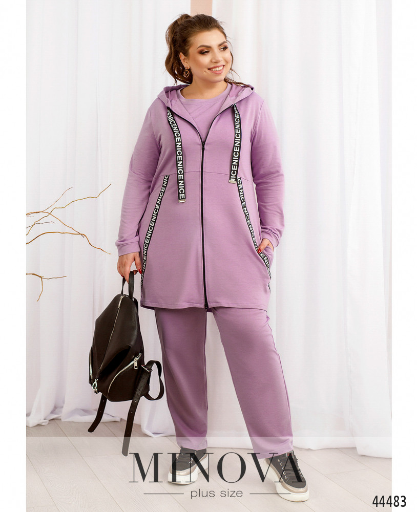 Привабливий костюм-трійка великого розміру. Толстовка м'яка, з мінімалістичним принтом на грудях, застібається на наскрізну блискавку по центру спереду. Капюшон без шнурків. На подолі та на рукавах м'які манжети. Підкладки немає. З боків - кишені. Футболка з коротими підгорнутими рукавами, з таким самим принтом, без застібок і кишень, горловина півкругла. Брюки з високою посадкою, з кишенями в швах, внизу підвороти, в поясі резинка.