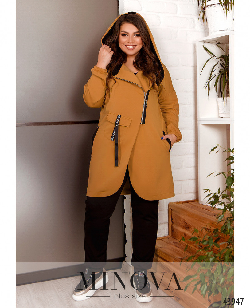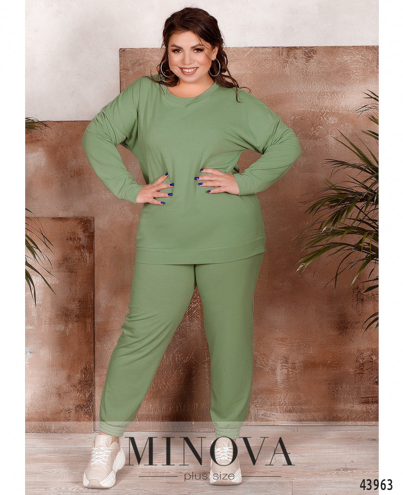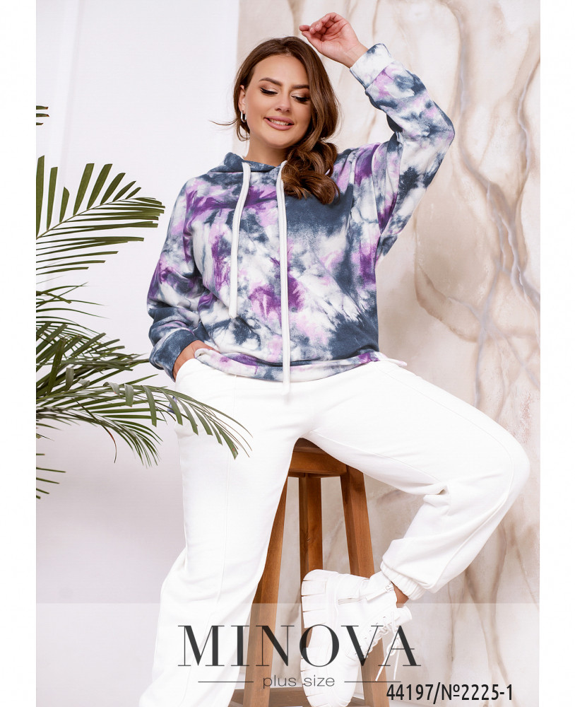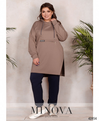 Комфортний та елегантний спортивний костюм великого розміру з модної та практичної натуральної тканини. Толстовка з капюшоном, через нього пропущено шнурок; кишень і застібок немає. Рукава і поділ із м'якими манжетами. По сторонам подолу невеликі розрізи, спинка трохи довша. Брюки із ушитою до поясу та манжетів резинкою, посадка висока, по сторонам - кишені у швах.
