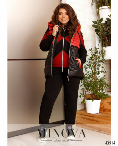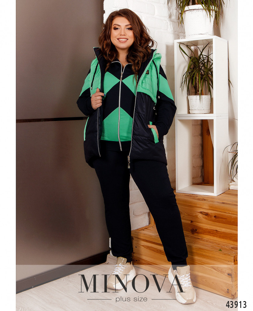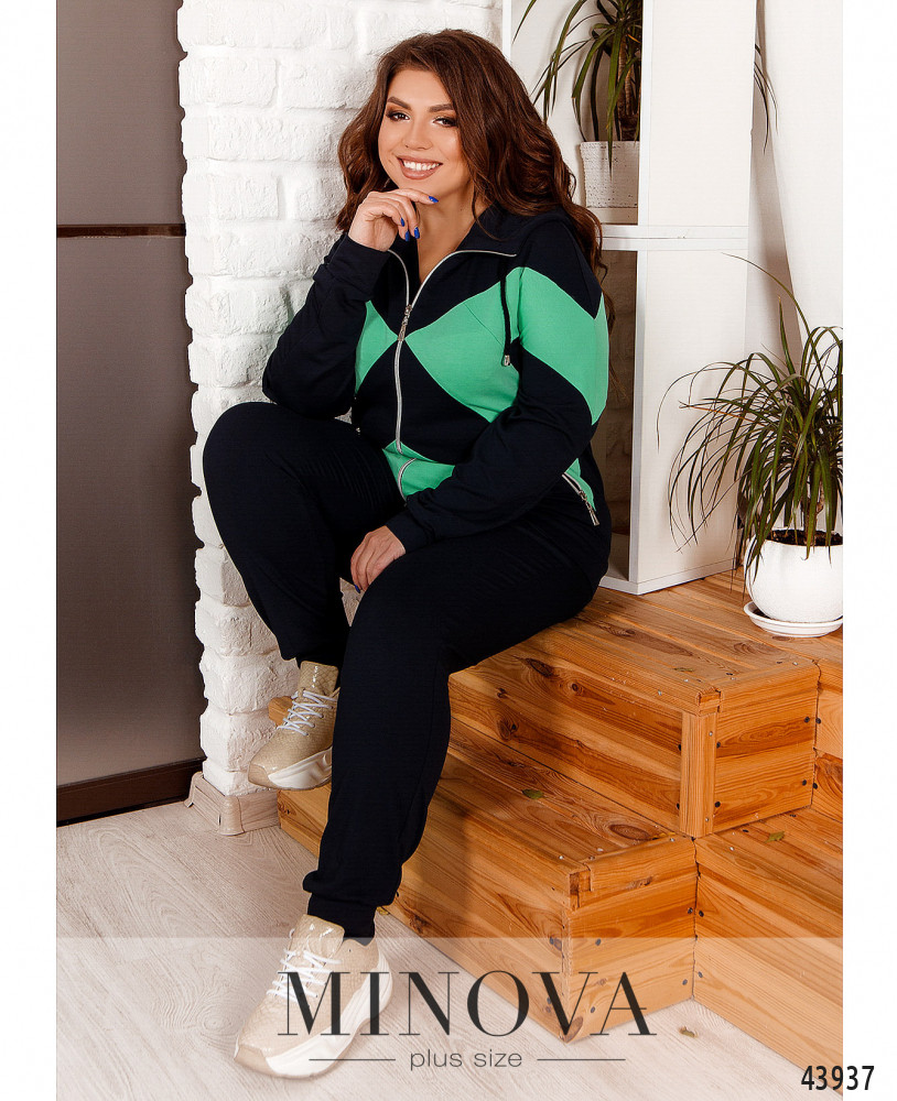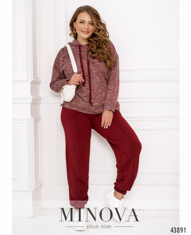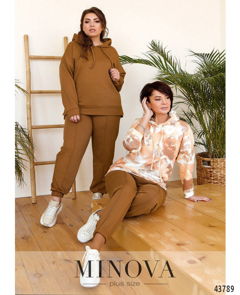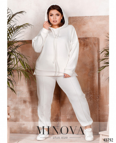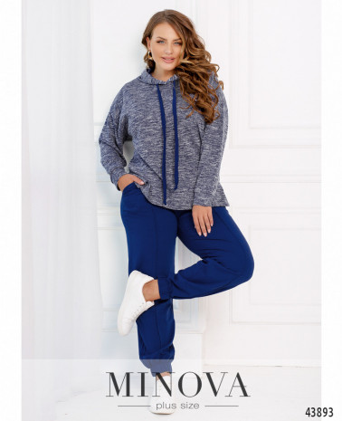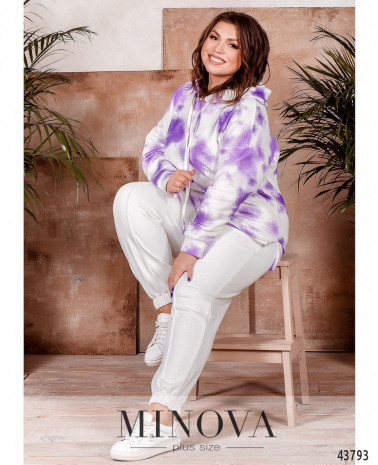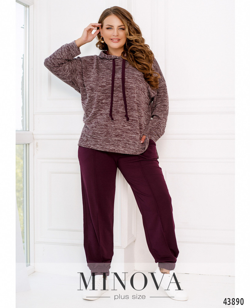 Комфортний та елегантний спортивний костюм великого розміру з модної та практичної натуральної тканини. Толстовка з капюшоном, через нього пропущено шнурок; кишень і застібок немає. Рукава і поділ із м'якими манжетами. По сторонам подолу невеликі розрізи, спинка трохи довша. Брюки із ушитою до поясу та манжетів резинкою, посадка висока, по сторонам - кишені у швах.