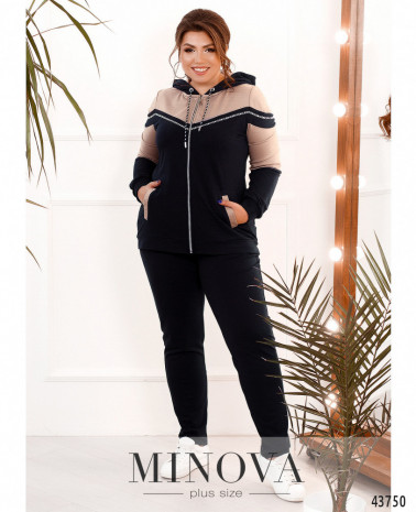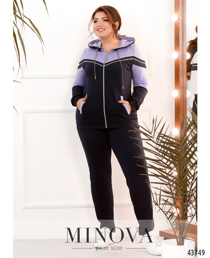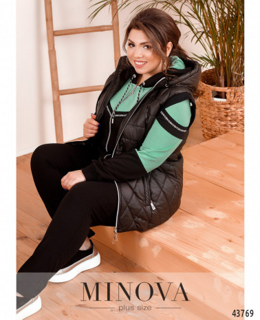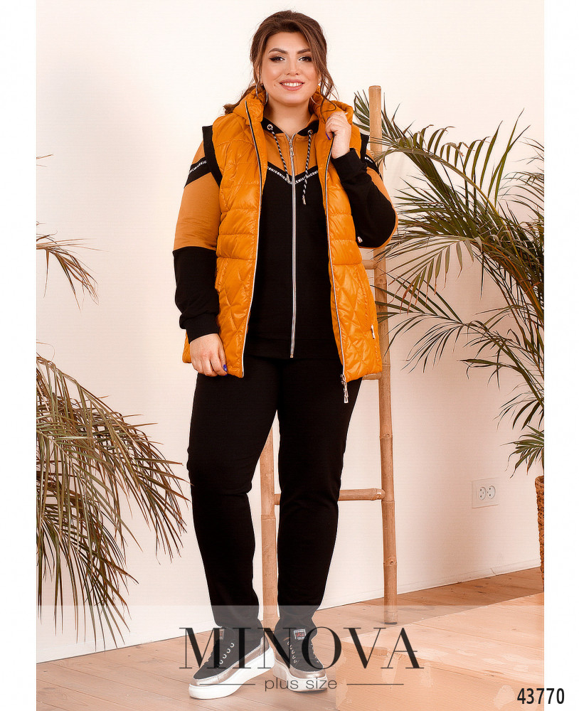 Удобный и стильный костюм-тройка батал, жилет из простёганной разнонаправленными стежками ткани. Жилет с подкладкой, с капюшоном, который не отстёгивается, через него пропущен шнурок. По бокам - врезные карманы под молнией. По центру - молния. Проймы с резинкой. Толстовка с молнией по центру, через капюшон пропущен шнурок, рукава и подол с манжетами. Декорирована лентой с принтом. Брюки с высокой посадкой и врезными карманами по бокам, в пояс вшита резинка.