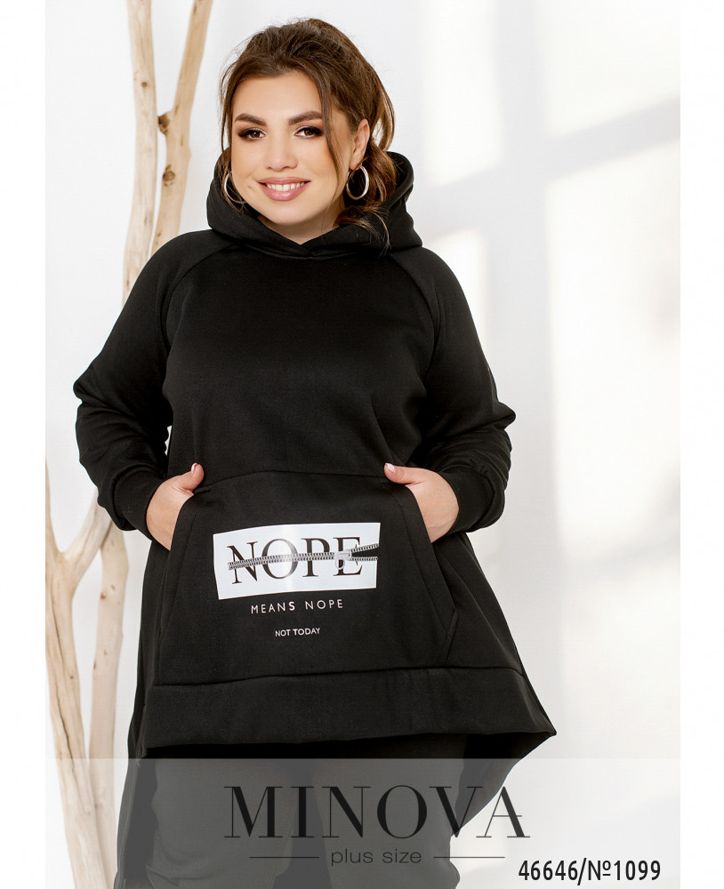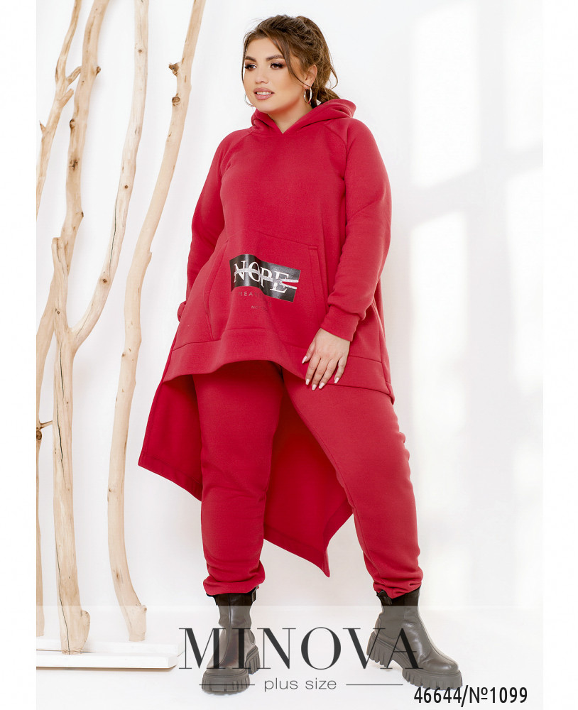 Оригінальний яскравий костюм батал подарує тепло і комфорт в прохолодні дні. Кофта з кишенями і капюшоном, що декорована яскравою стрічкою з принтом спереду і на рукавах з манжетами, застібається на змійку спереду по центру. Штани з високою талією на резинці доповнені кишенями в бічних швах і манжетами.