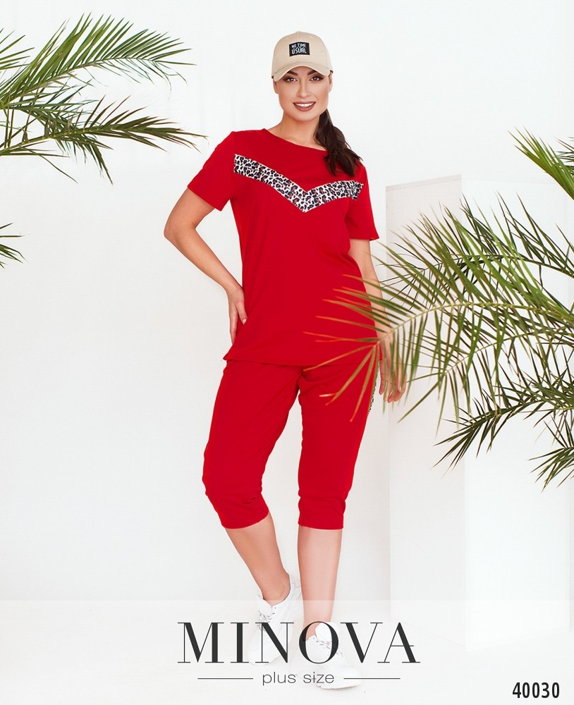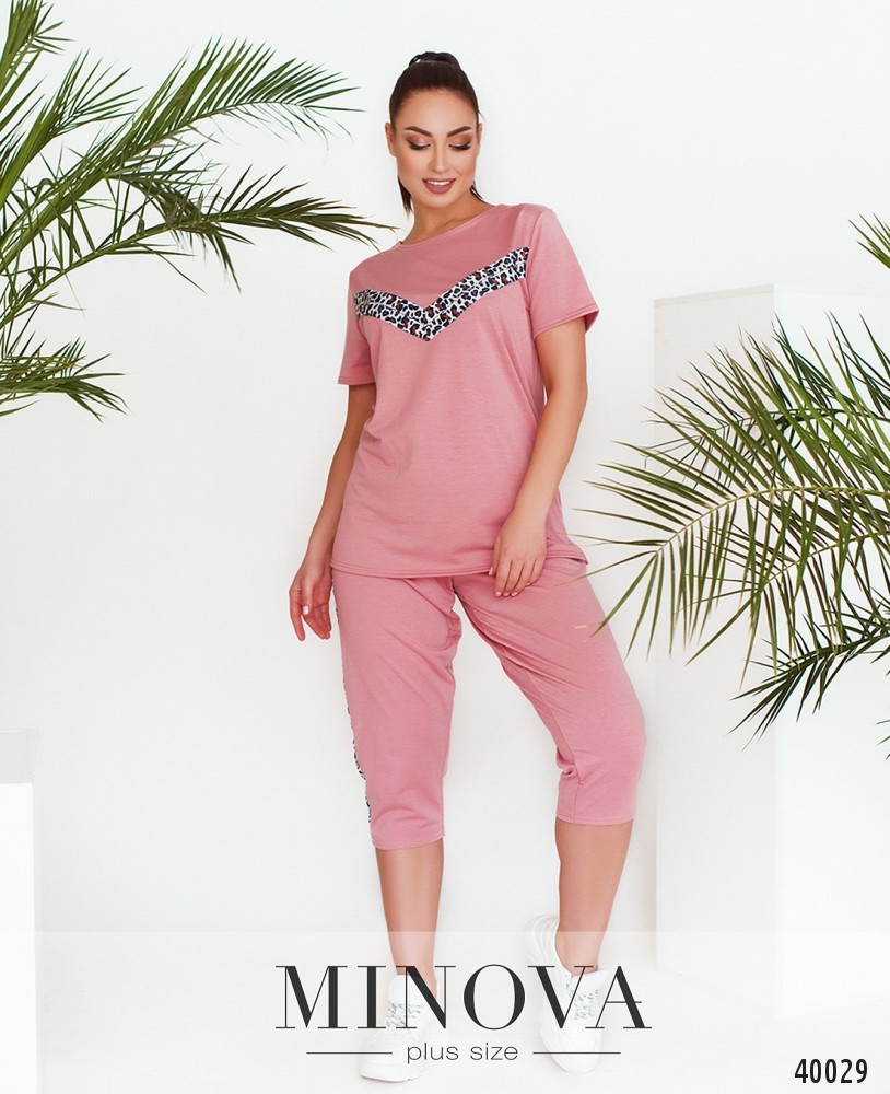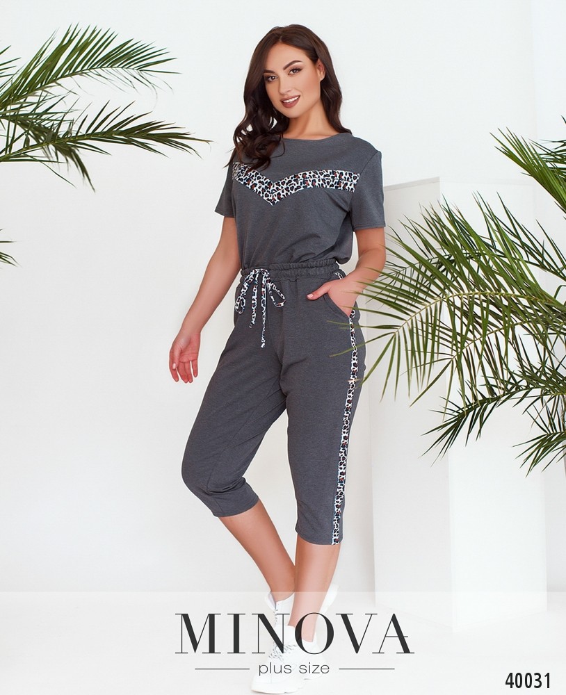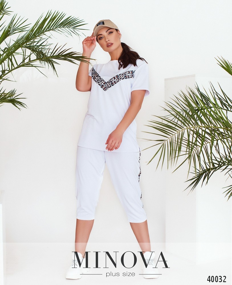 Стильный спортивный костюм большого размера с актуальным принтом на футболке и на брюках в виде лампас. Футболка без карманов и застёжек, брюки со вшитой в пояс резинкой, по бокам врезные карманы, посадка высокая.