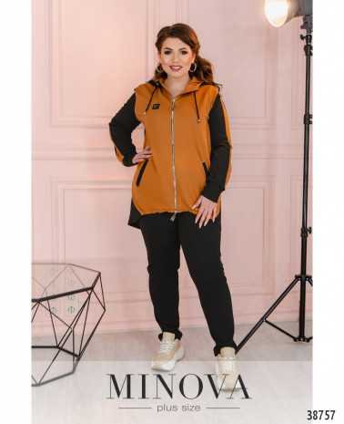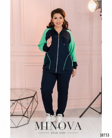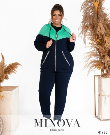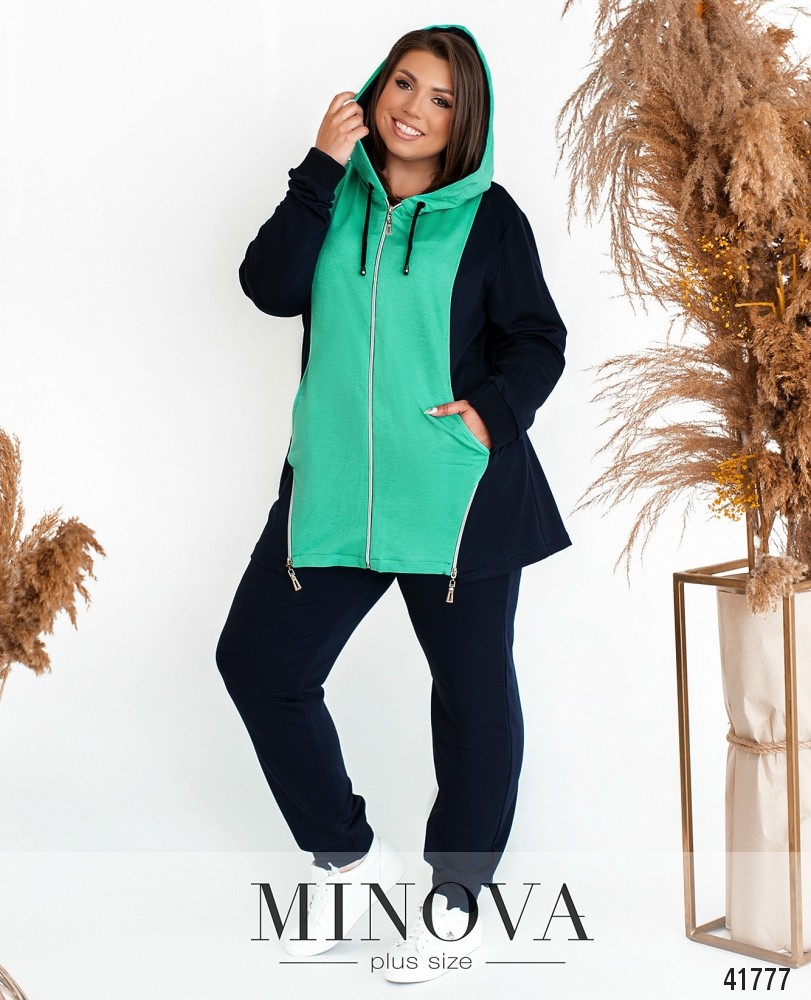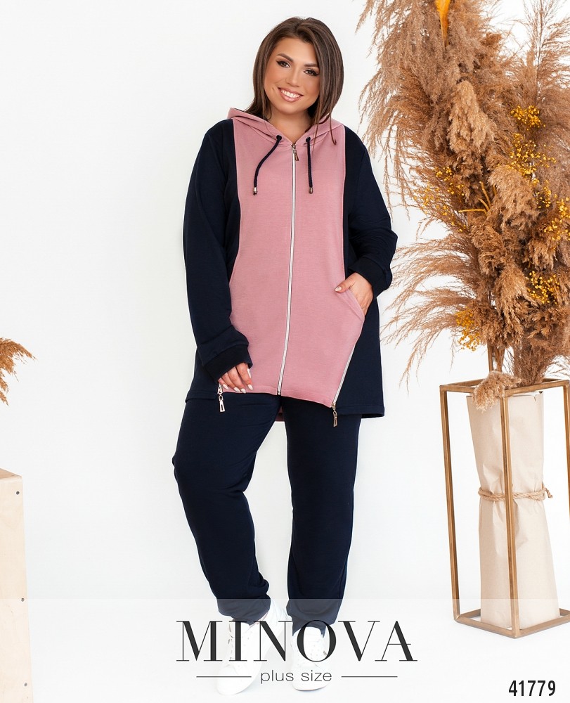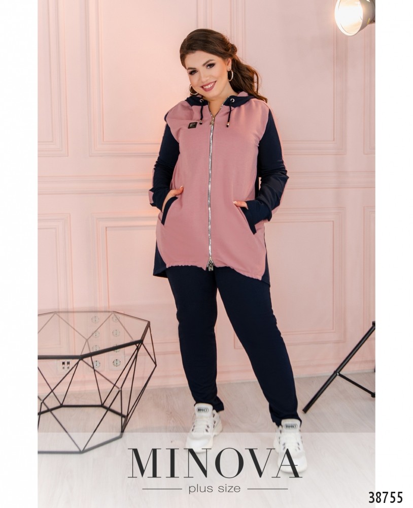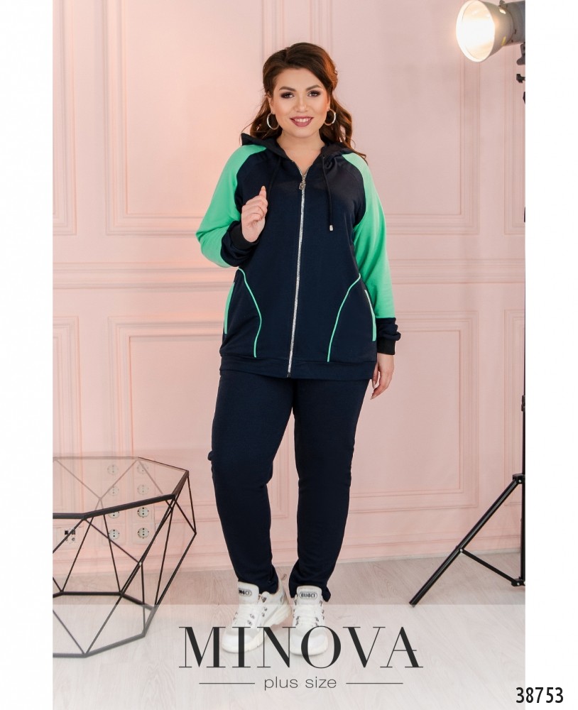 Стильный спортивный костюм большого размера с актуальным принтом на футболке и на брюках в виде лампас. Футболка без карманов и застёжек, брюки со вшитой в пояс резинкой, по бокам врезные карманы, посадка высокая.