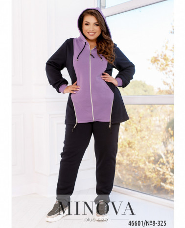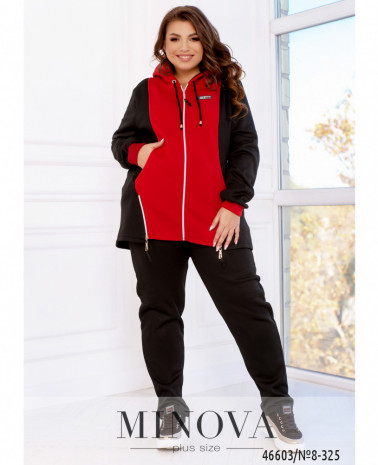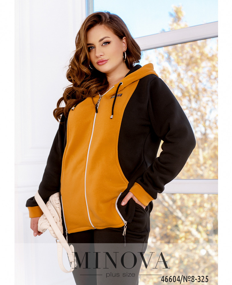 Яркий спортивный костюм, дополненный контрастными однотонными вставками, не только очень теплый, но и комфортный. В комплект входят однотонные минималистичные брюки на резинке с карманами, а также выразительная кофта с капюшоном, дополненная длинными рукавами с манжетами и двумя небольшими рабочими змейками, выполняющими декоративную функцию.