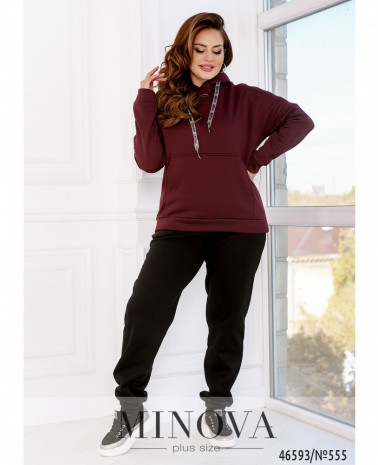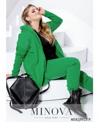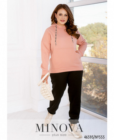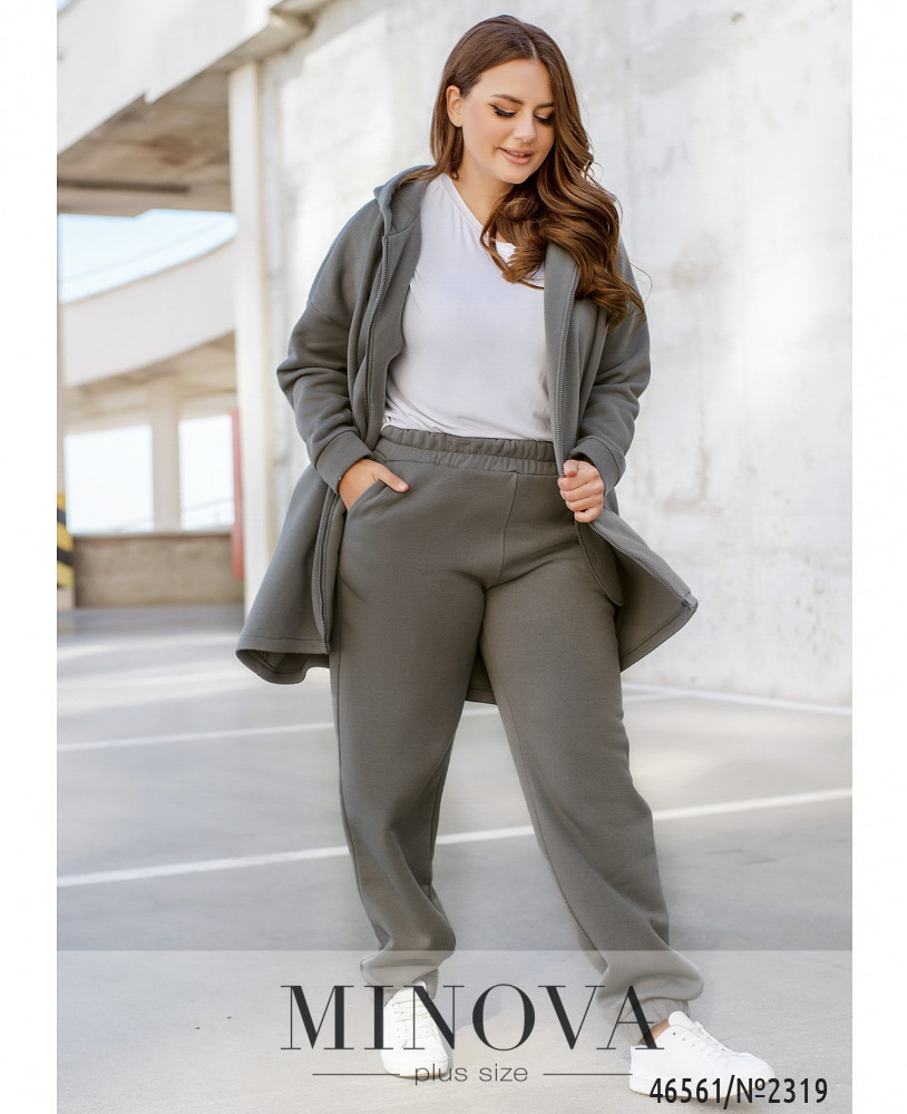 Монохромный утепленный спортивный костюм — идеальный вариант для любителей комфортного минимализма. В комплект входят лаконичные брюки-джоггеры на резинке с карманами в боковых швах, а также удлиненная кофта-туника на змейке с капюшоном и карманами, изюминкой которой являются рукава с манжетами и приспущенной линией плеч и ассиметричный низ, удлиненный по спинке.