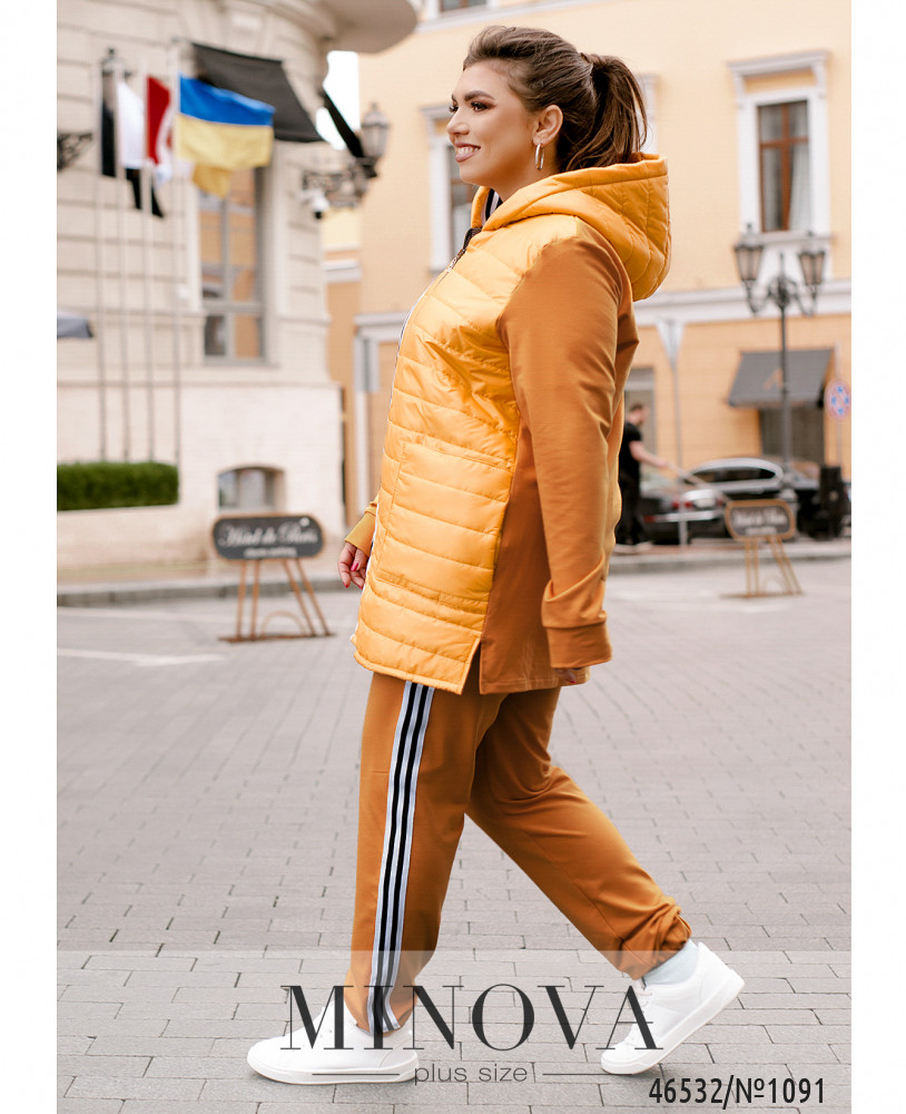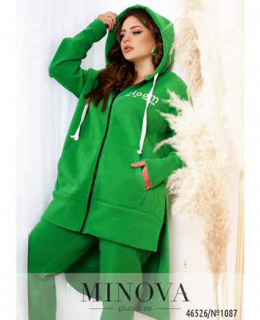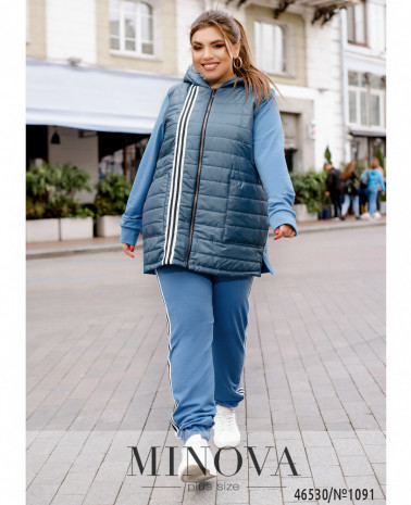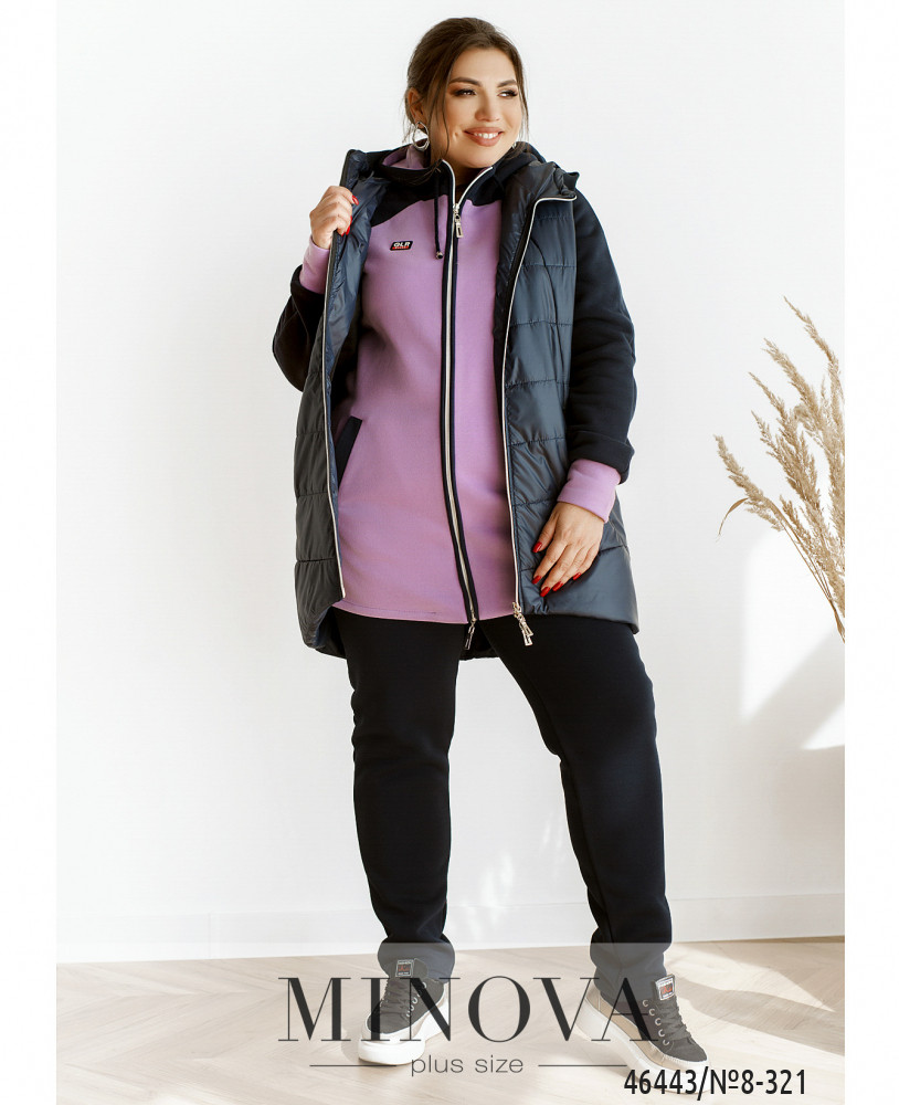 Теплий і комфортний костюм-трійку можна носити разом або розділити, створюючи різні образи з іншими речами. У комплект входять стильний жилет на блискавці з капюшоном і кишенями, м'яка кофта на змійці, доповнена капюшоном кишенями і рукавами "реглан", а також штани з вшитою в пояс резинкою і кишенями в бічних швах.
