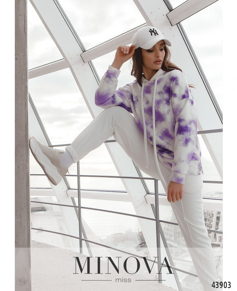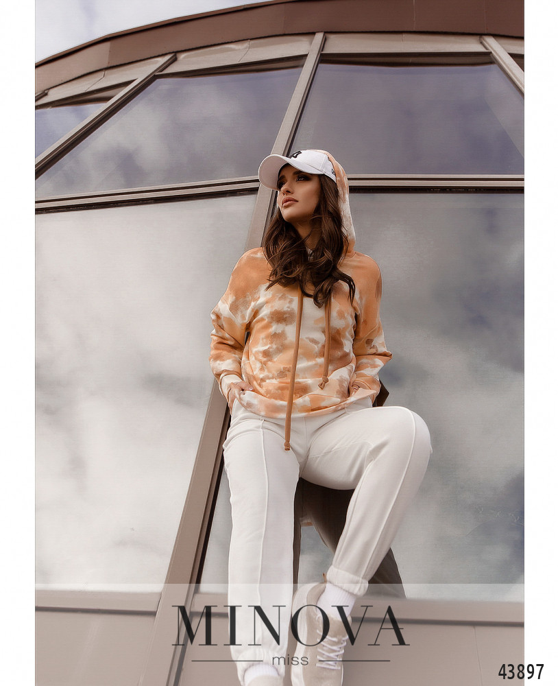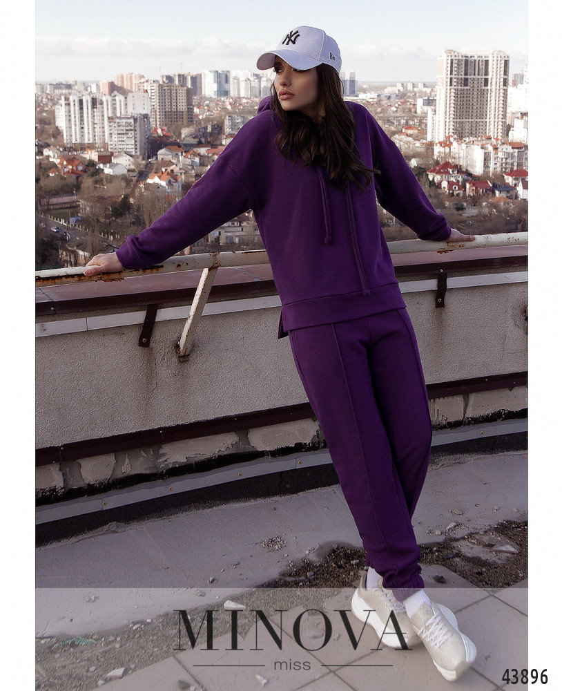 Элегантный и яркий костюм с толстовкой и брюками. Брюки с высокой талией, в пояс и в манжеты вшита резинка. По бокам - карманы в шве, спереди нашиты швы-стрелочки. Застёжек нет. Толстовка с капюшоном и шнурками, отверстия для шнурков без люверсов. Карманов нет, линия плеча приспущена. По бокам подола небольшие разрезы. Без застежек.