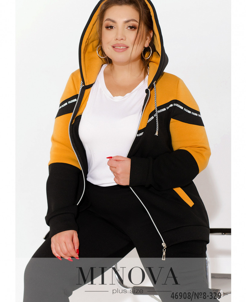Яскравий спортивний костюм, виконаний з м'якої тканини, дозволить створювати стильні і різноманітні образи у вуличному стилі. У комплект входять лаконічні однотонні штани на резинці з кишенями в бічних швах і манжетами, а також виразна кофта, з яскравими вставками, доповнена капюшоном, кишенями з боків і змійкою по центру.
