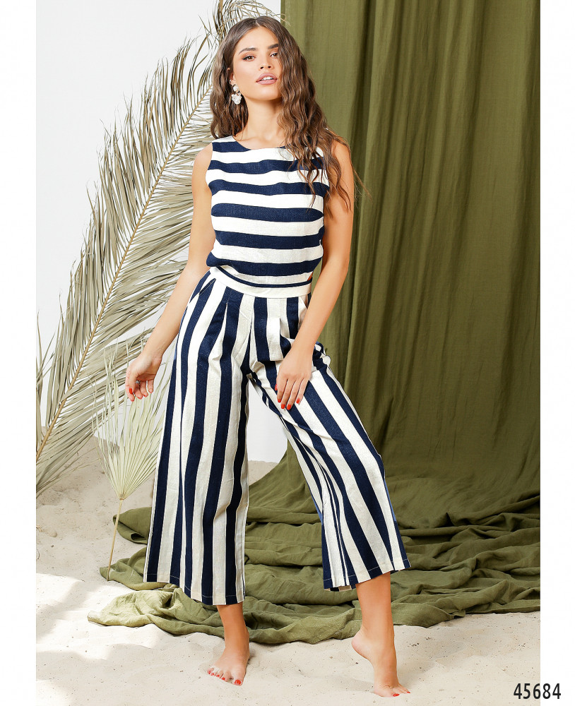 Елегантний смугастий комбінезон з брюками, верх закритий, з боків на талії - оригінальні трикутні вирізи. Застібається на блискавку, вшиту по спинці. На талії - невеликі декоративні складки. З боків - кишені в шві. Виріз горловини півкруглий. На грудях виточки. Пояс НЕ входить в комплект.