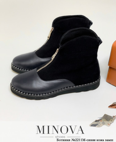 Удобные, мягкие и слегка утеплённые изнутри ботинки из новой коллекции женской обуви Minova выполнены из натуральной мягкой кожи. Основная часть отличается от носка: в большинстве случаев это сочетание замши и гладкой кожи, но есть и варианты с кожей «под рептилию» и лака, и другие варианты. Вставка на носке чуть расширена до середины подошвы, что особенно его укрепляет и делает эту обувь практичной. Спереди на подъёме, от носка до штаферки – рабочая змейка, штаферка скруглена. Подошва снизу мелкоребристая, каблучок едва заметен, ботинки устойчивы на любой поверхности. Такая модель позволит создать стильный городской образ с джинсами или костюмом.