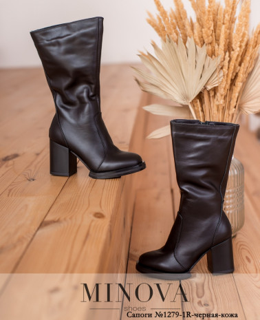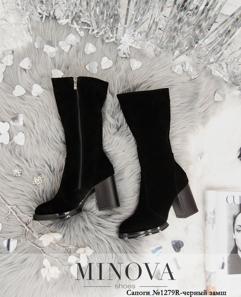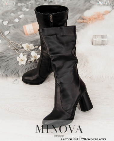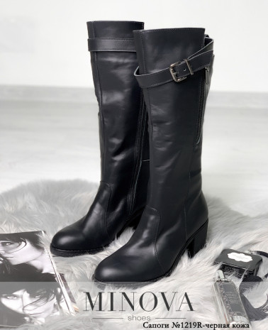 Зручні високі чоботи з асиметричним верхом. На внутрішньому боці – блискавка від верха до підошви, та невелика виточка для розширення халяви. Каблук невисокий, стійкий, підошва з крупноребристим рисунком протектора.