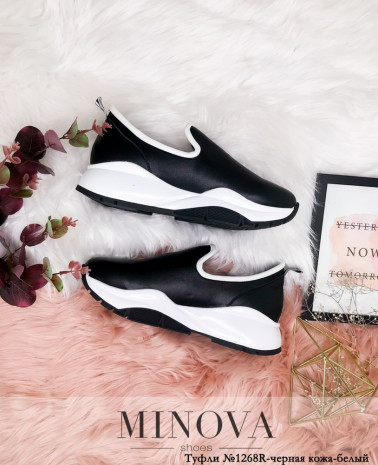 Міські кросівки-сліпони з натуральної шкіри. Без шнуровки та блискавок. Підошва висока, подовжена ззаду, контрастна, звужується до носку. Ззаду петелька. Задник відрізний, укріплений. Верхній рант також контрастний. Висота танкетки спереду: 2 см