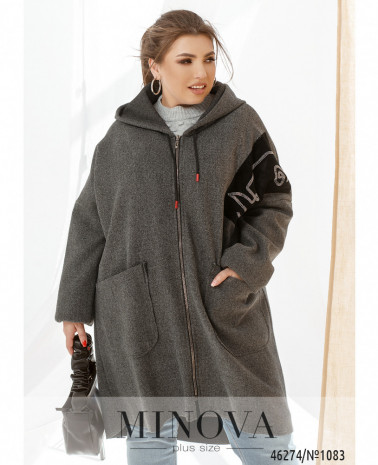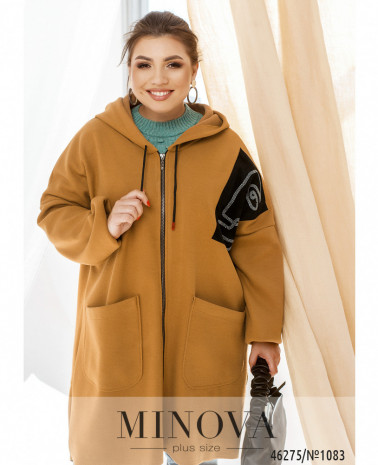 Уютный и удобный кардиган батал с капюшоном, накладными карманами по бокам и молнией по центру. На левой стороне груди – бархатная нашивка, украшенная узором из пайеток. Через капюшон пропущен шнурок. Кофта без подкладки, рукава без манжет.