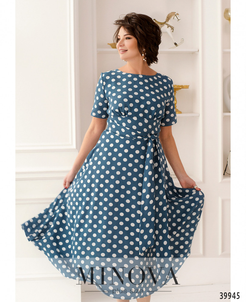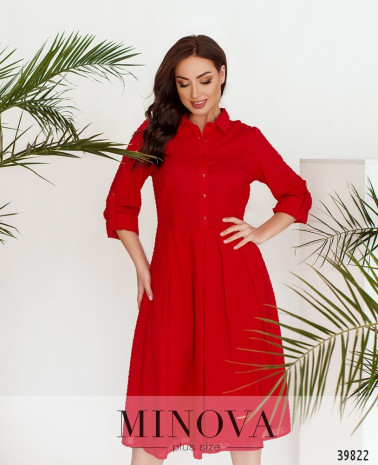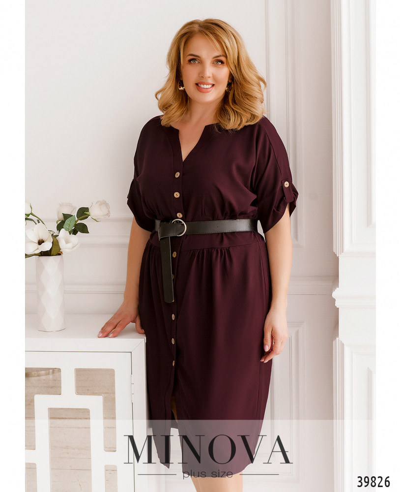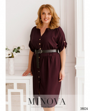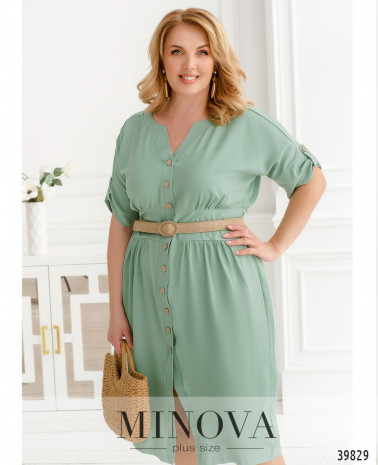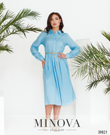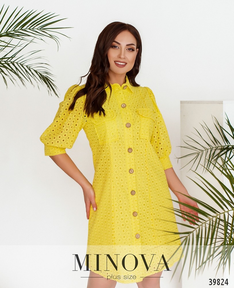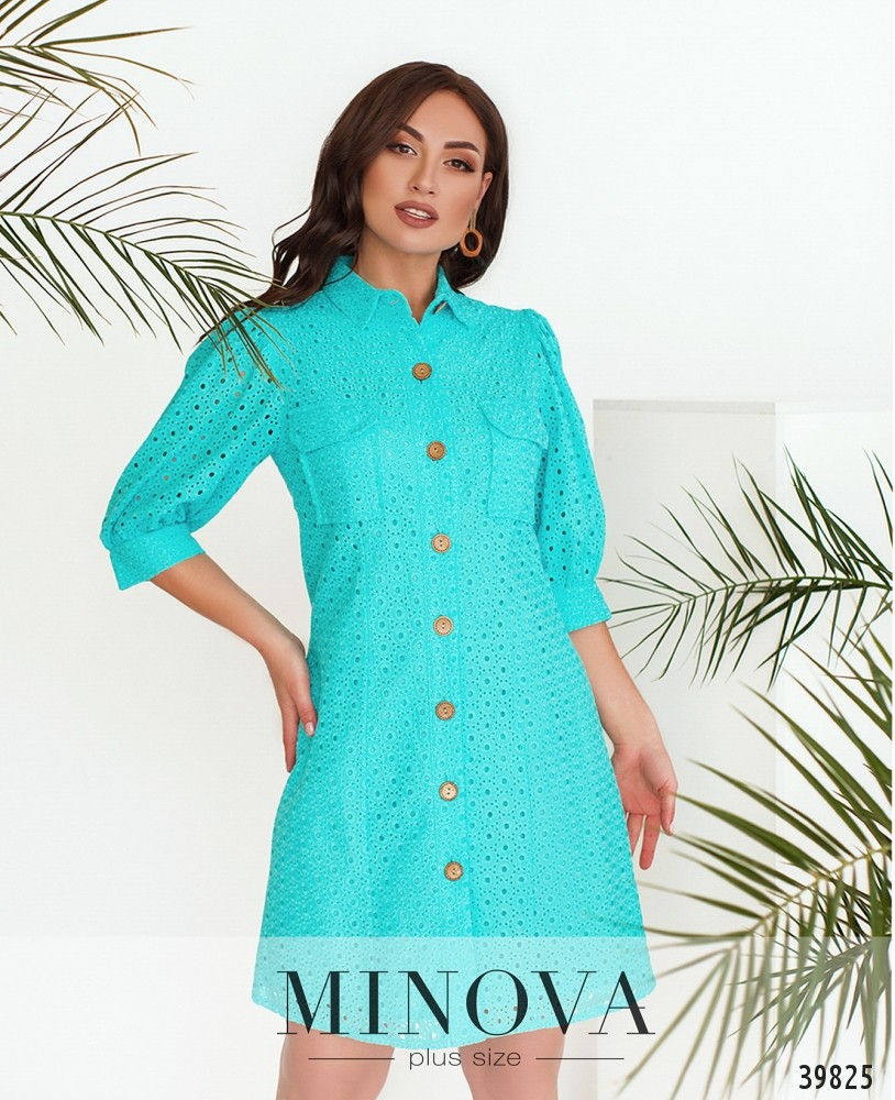 Ажурна сукня батал з підшитим м'яким нижним шаром. Рукава - подовжені "ліхтарики" з манжетами, без гудзиків. Комірець відкладний, на грудях - накладні кишені, застібається на низку гудзиків спереду на планці.