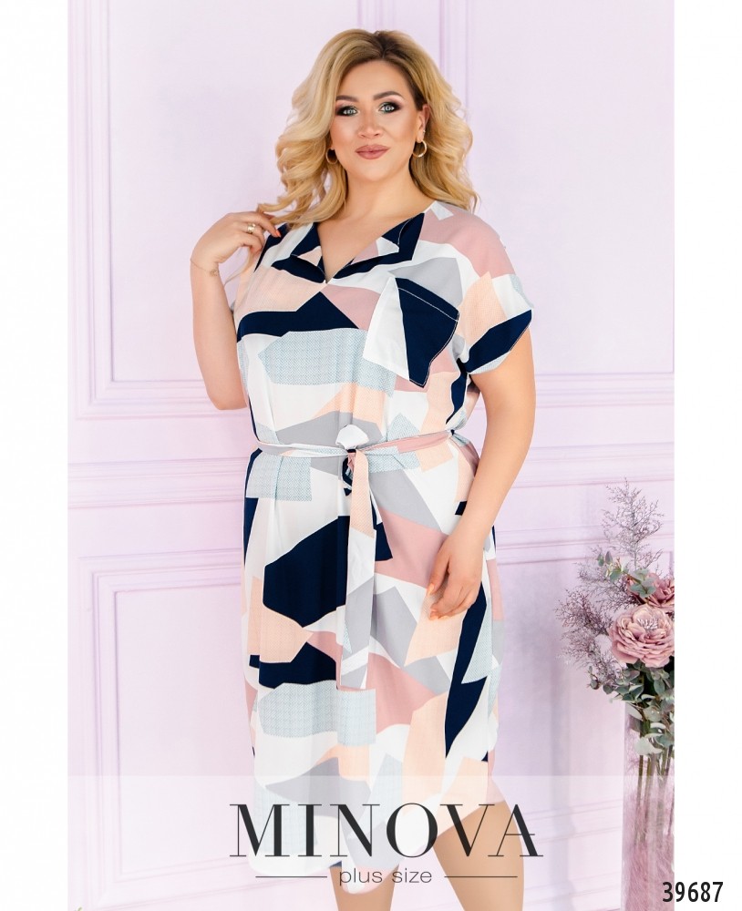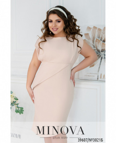 Чепурна та оригінальна сукня плюс сайз з ілюзією підшитої накидки. Виріз горловини півкруглий, під ним - декор з камінцями, тканина призібрана вгорі і внизу. Рукава дуже короткі, без манжетів. З обох боків - прорізні кишені, застібок немає.