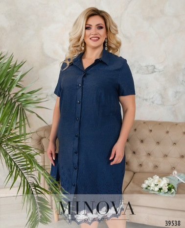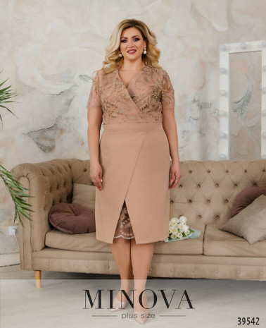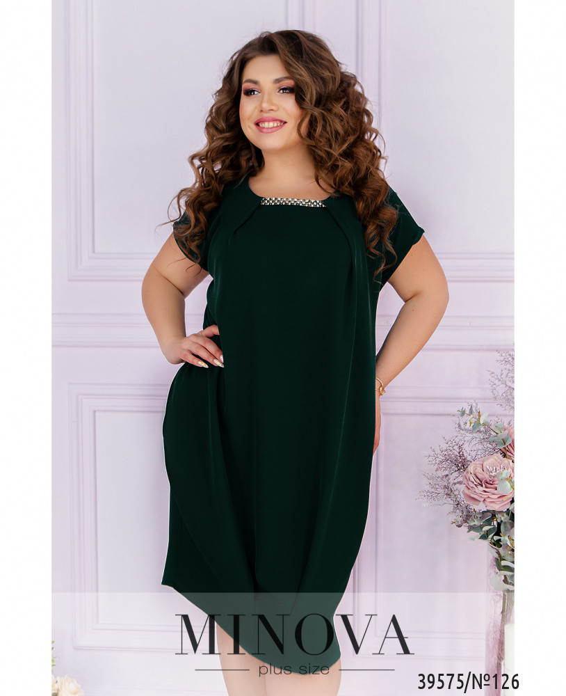 Нарядное и оригинальное платье плюс сайз с иллюзией подшитой накидки. Вырез горловины полукруглый, под ним - декор с камнями, ткань присобрана сверху и снизу. рукава очень короткие, без манжет. По бокам - врезные карманы, застёжек нет.