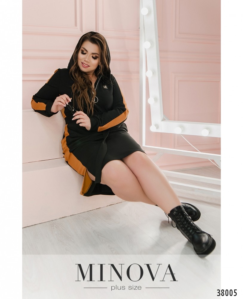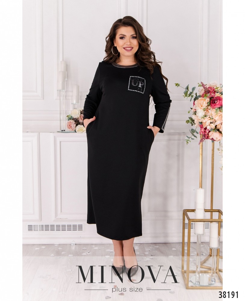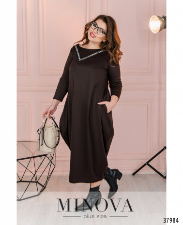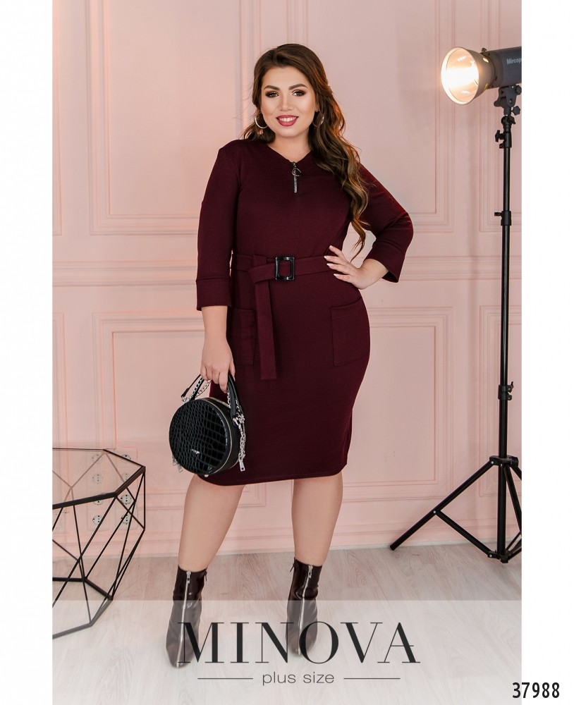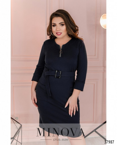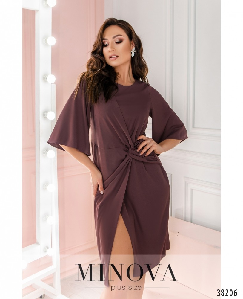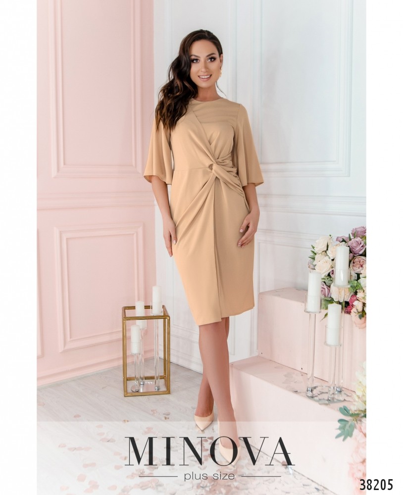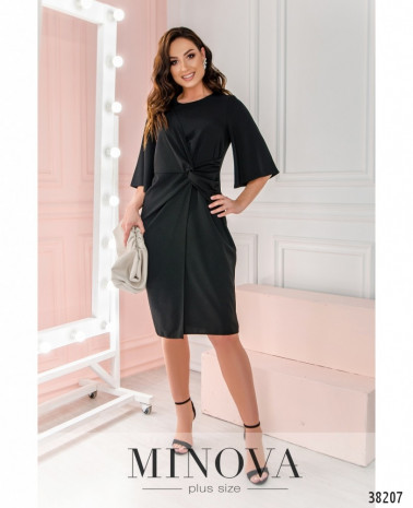 Оригинальное приталенное платье плюс сайз, подол слева присобран и «захвачен» широкой подшитой лентой, правая часть запахнута и подшита изнутри. Карманов нет. Рукава широкие, без манжет. Застёгивается на вшитую по спинке молнию. Вырез горловины полукруглый.