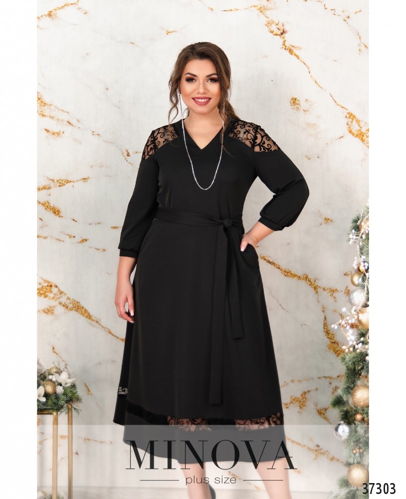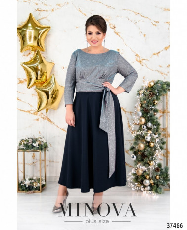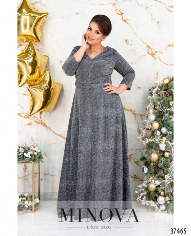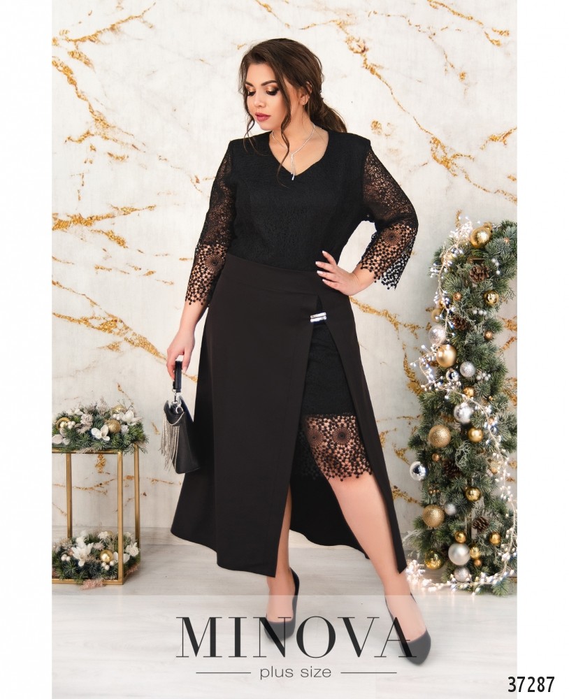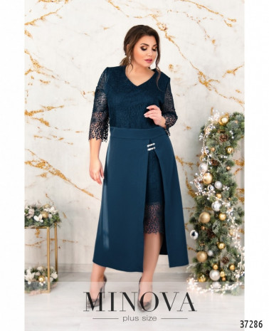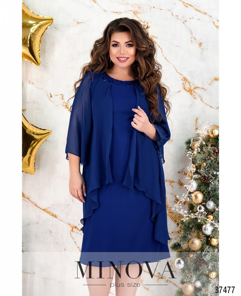 Нарядное платье большого размера с подшитой лёгкой накидкой. Крой прямой, застёжек и карманов нет. Вырез горловины полукруглый, неглубокий, украшен кружевом и пайетками. Рукава расклешённые, из полупрозрачной ткани без подкладки. Сзади накидка ровная, спереди ниспадает оборками.
