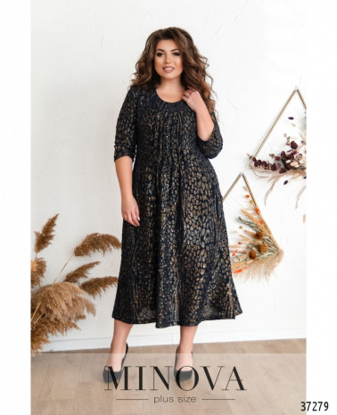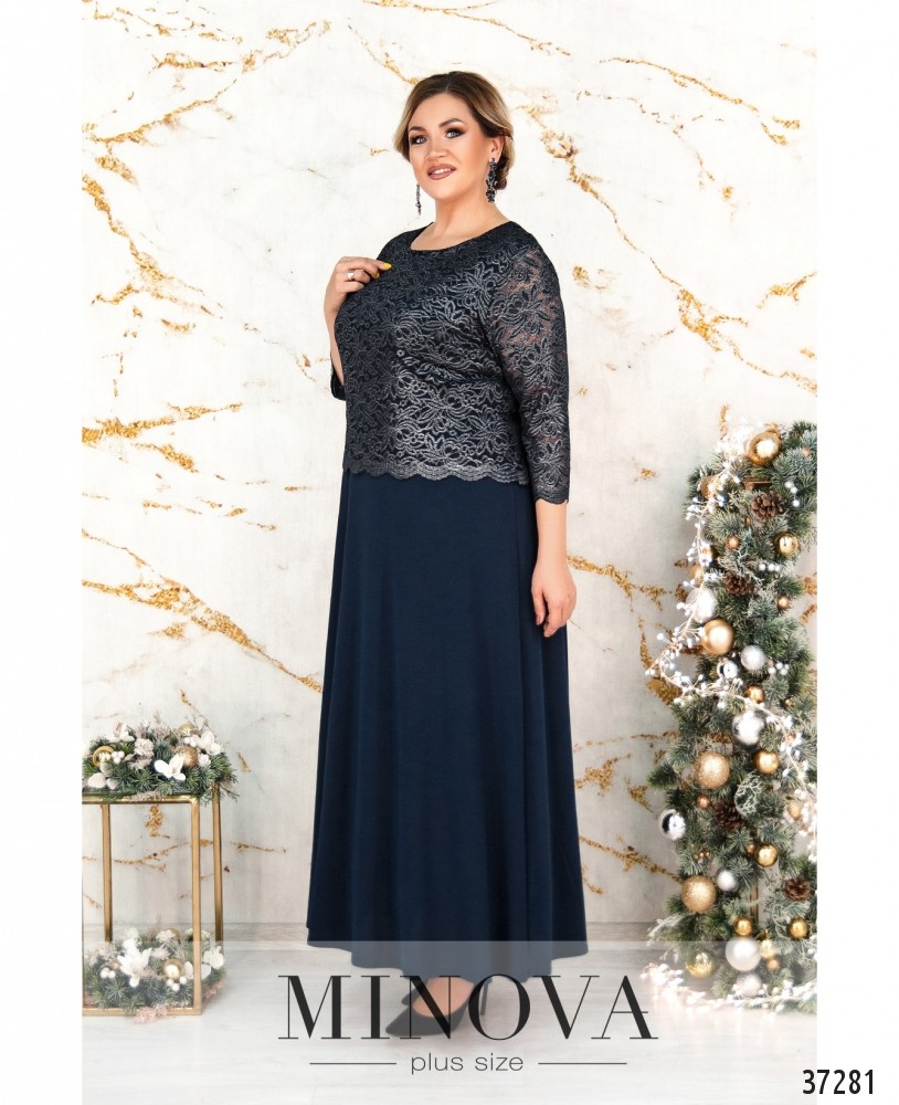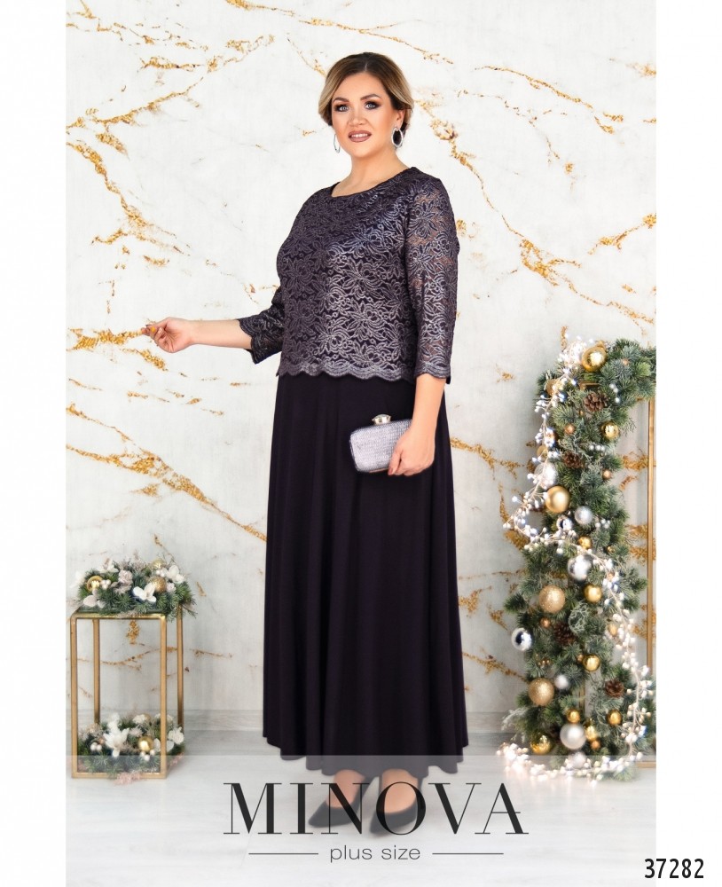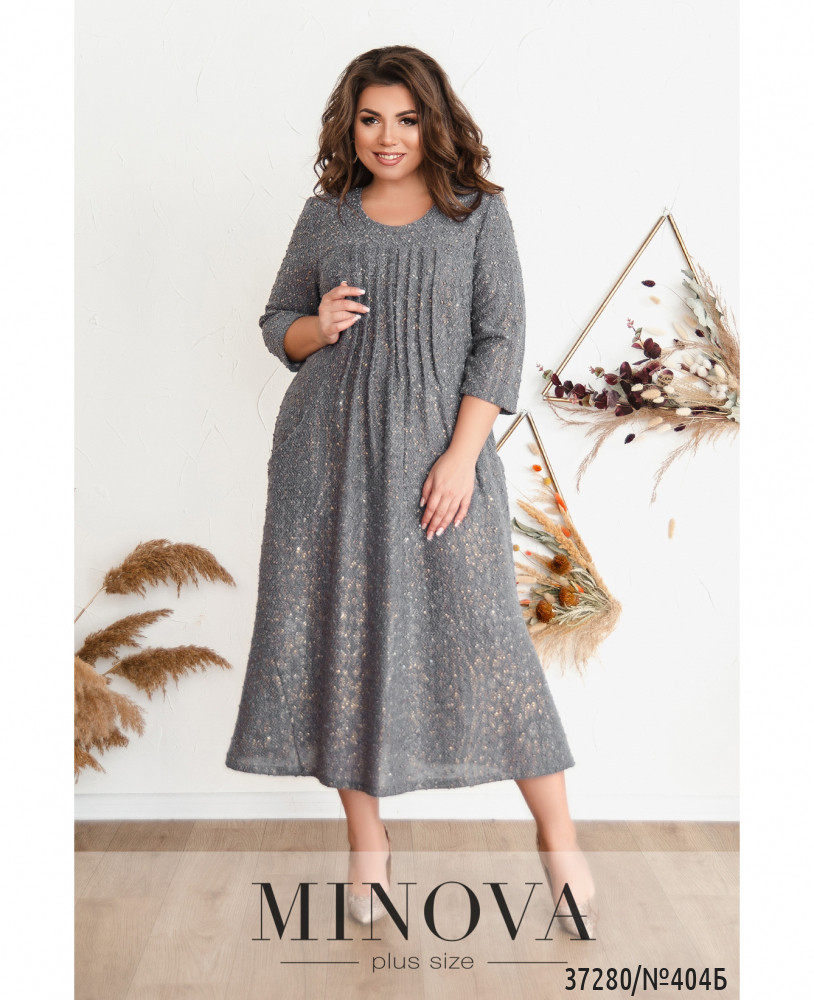 Праздничное элегантное платье большого размера, крой прямой, сверху подшита накидка из полупрозрачной сеточки с вышивкой. Украшено небольшой брошью в виде цветка. Рукава полупрозрачные, без подкладки и без манжет. Карманов и застёжек нет. Вырез горловины широкий, полукруглый.