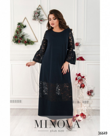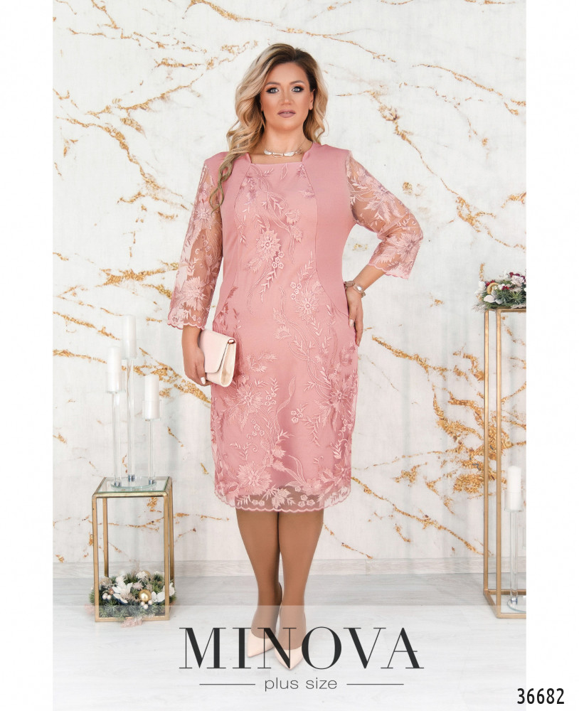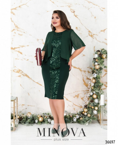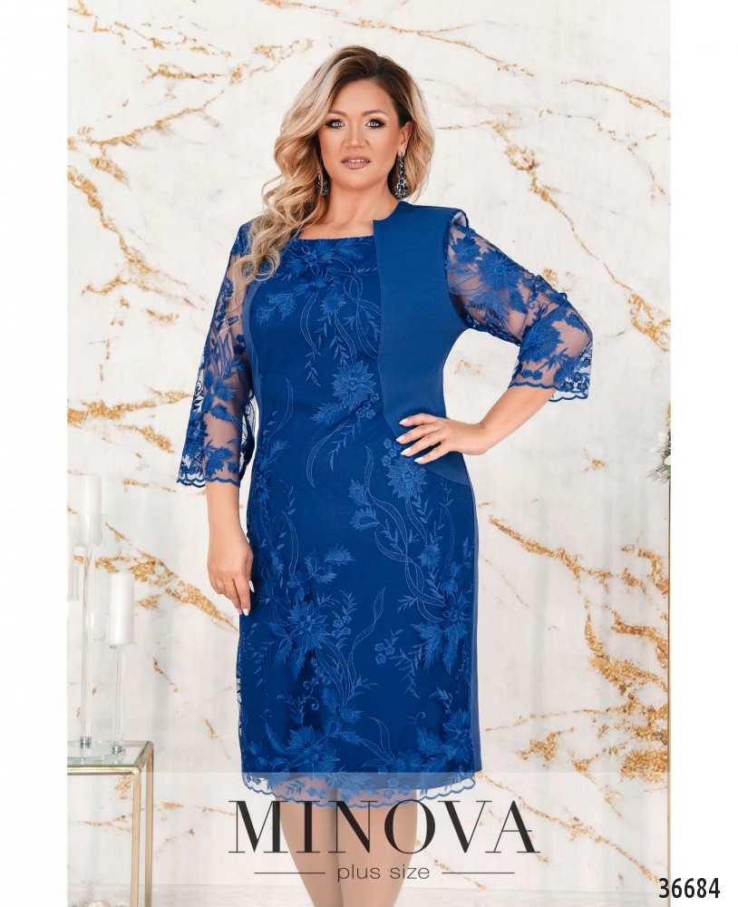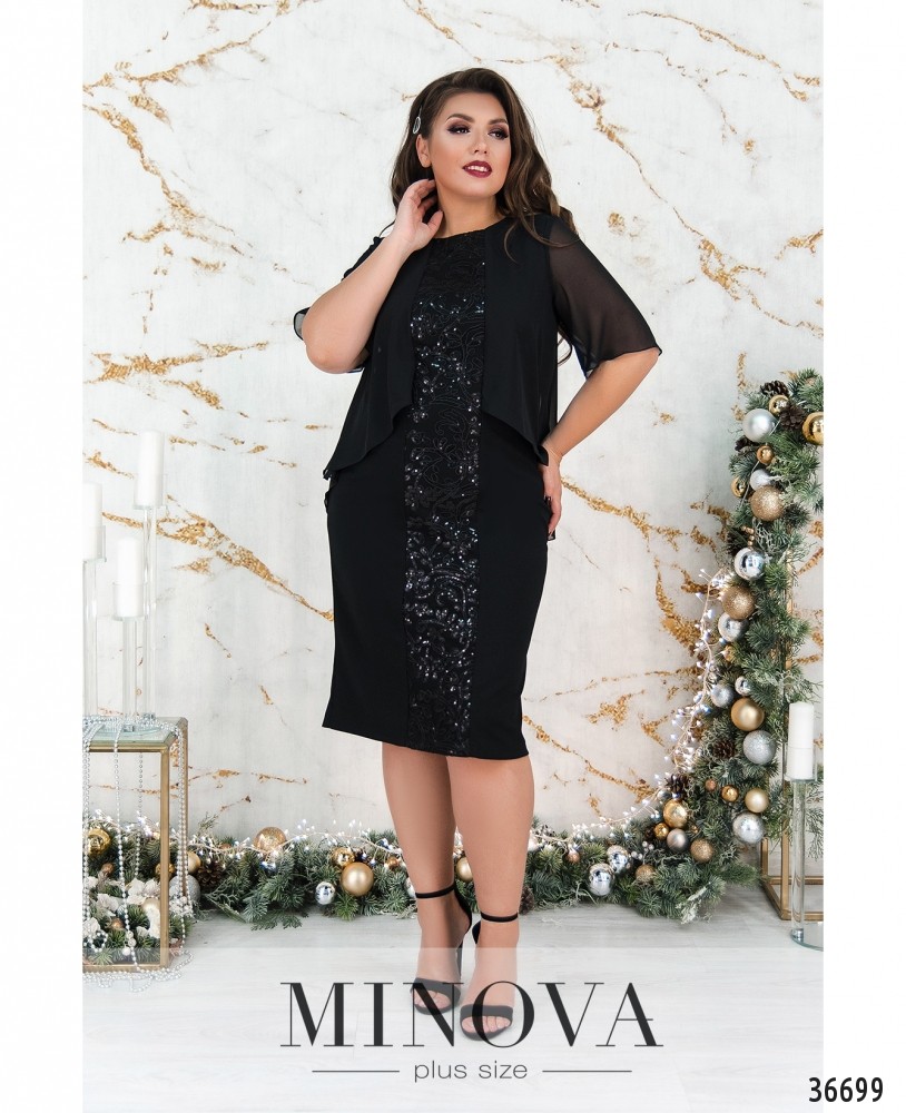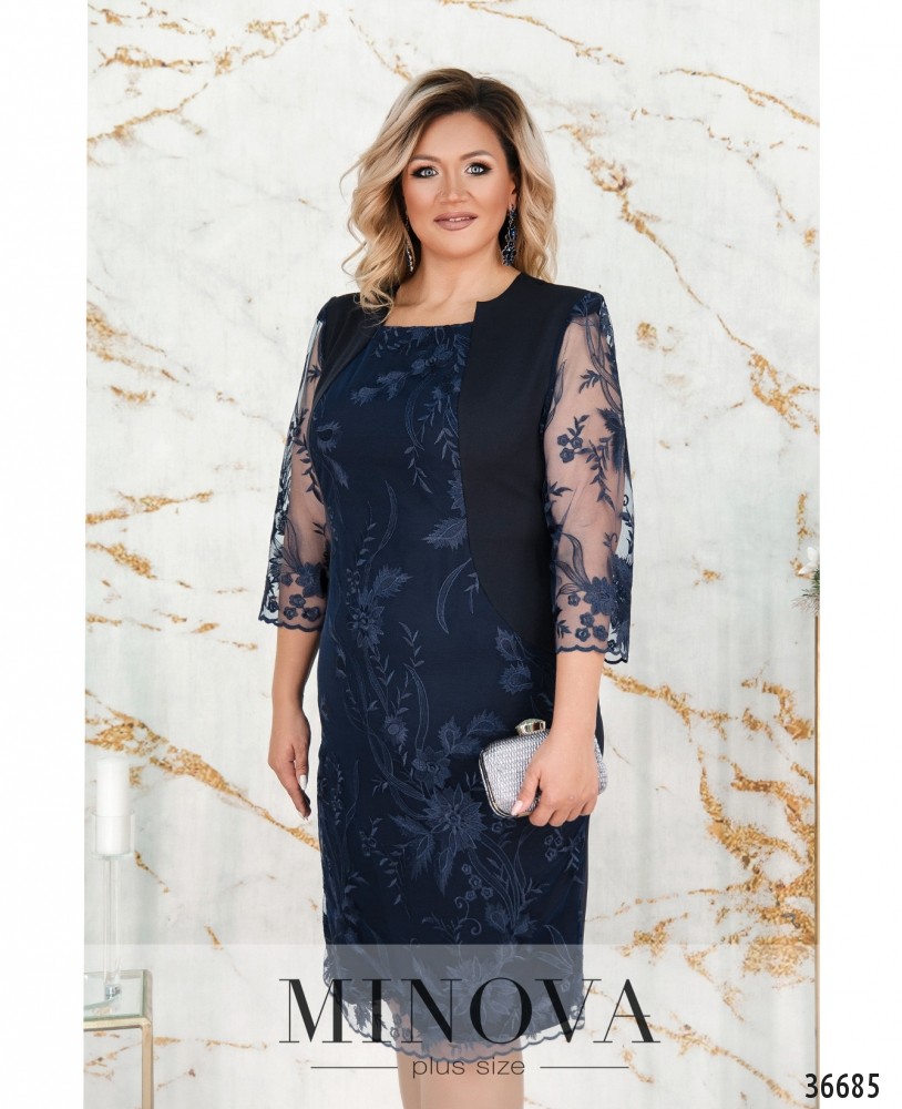 Нужно выглядеть нарядно и в то же время сдержанно? Minova предлагает отличный вариант платья батал. Платье прямого кроя, но эта особенность сглаживается подшитой сверху накидкой, ниспадающей мягкими асимметричными складками. Ткань мягкая, приятная к телу. Спереди по центру – широкая полоса с вышивкой и пайетками, от полукруглого выреза горловины до подола. Карманы и застёжки отсутствуют. Накидка из полупрозрачной ткани, сзади полностью закрывает спинку до бедра. Рукава до локтя, без подкладки и манжет, полупрозрачные, свободные. Платье длины миди, будет хорошо смотреться на любой фигуре с обувью на танкетке или каблуке.