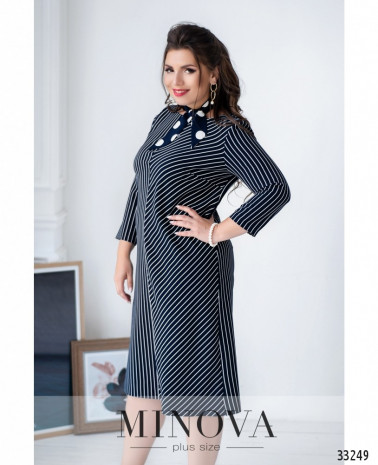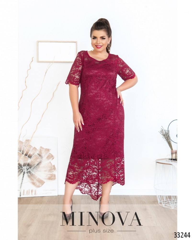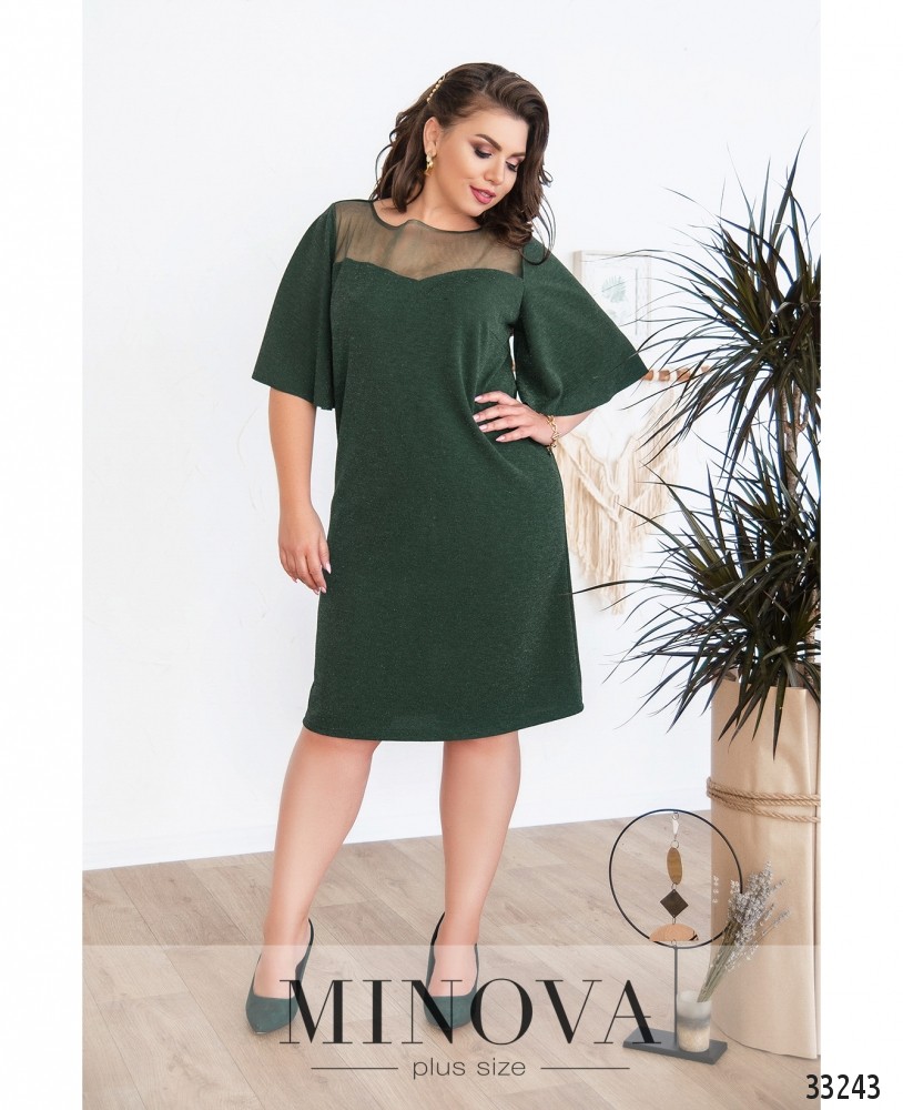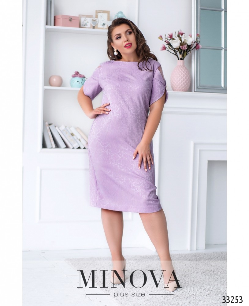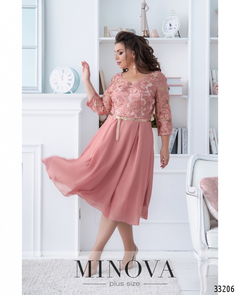 Ніжна сукня батал, що складається з двох шарів: прозорого та легкого верхнього і більш щільного нижнього, який не просвічує. Рукава повністю прозорі. Виріз горловини - широкий, півкруглий, кишень немає. Застібається на вшиту по спинці блискавку. На поясі вшито резинку, тому поділ спадає м'якими складками.