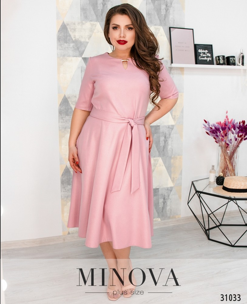 Жіночна сукня міді в романтичному стилі з непомітною блискавкою на спинці сподобається тим, хто цінує лаконічні класичні форми. Мінімалістичний крій верхньої частини приталеної сукні з напівкруглим вирізом горловини і короткими рукавами доповнений повітряним подолом напівкльош без кишень. Силует підкреслять скульптуруючі виточки і контрастний пояс, який входить в комплект.