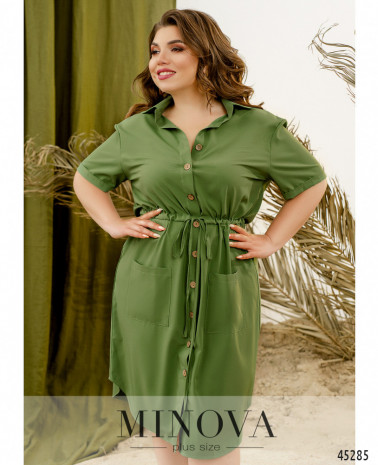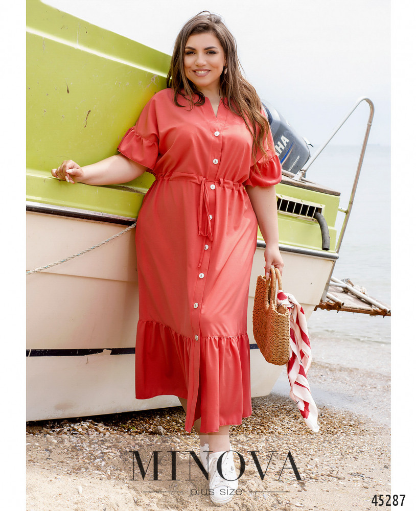 Яркое платье батал с короткими рукавами-оборками, застёжка - ряд пуговиц спереди на планке. Подол с длинными оборками. По бокам - карманы в шве. Через талию под кулиской пропущен шнурок.
