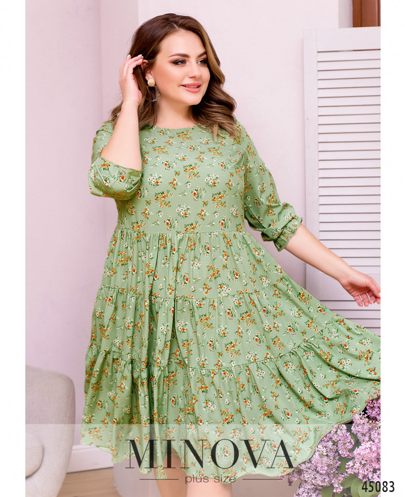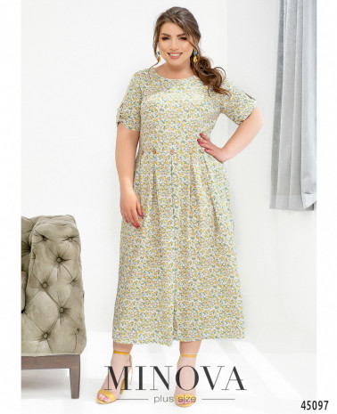 Яркое летнее платье с цветочным принтом из легкой натуральной ткани. Полукруглый вырез горловины, классические рукава и широкие складки на подоле, украшенные декоративными пуговицами, сделают ваш образ нежным и женственным.